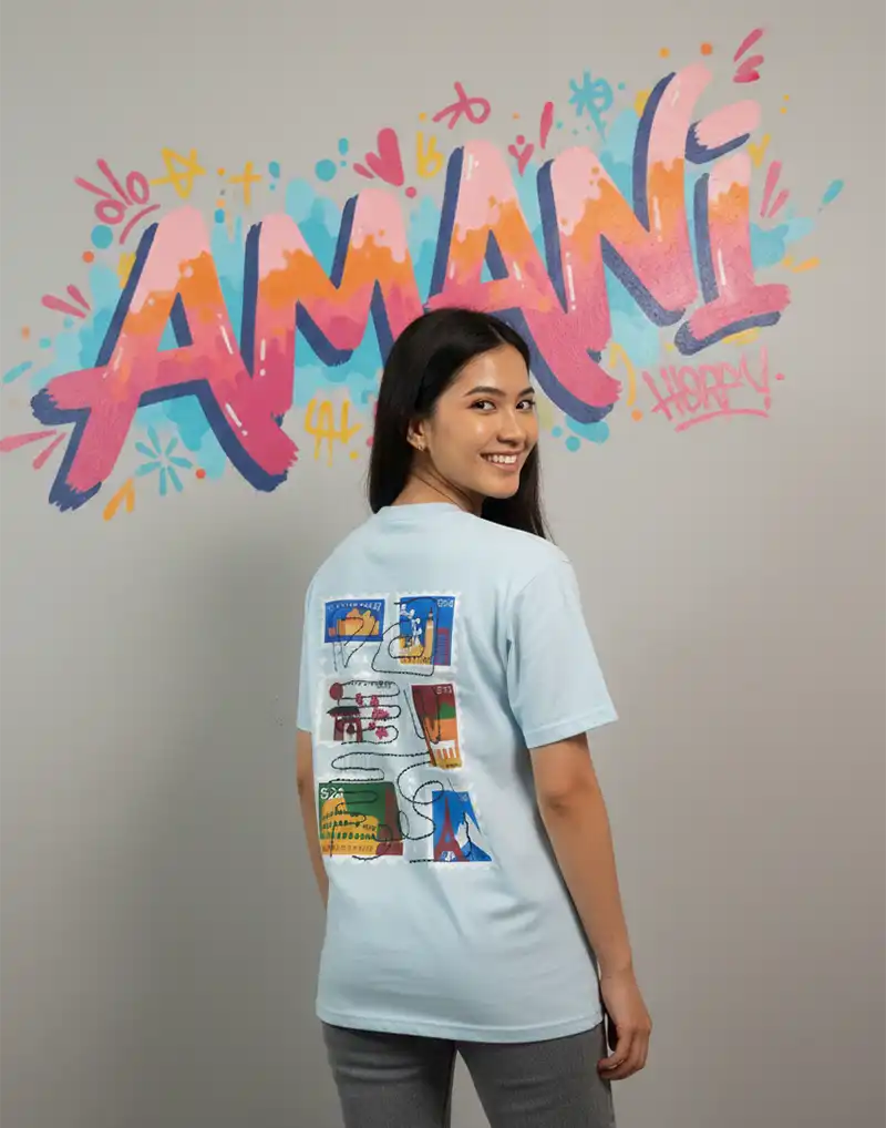 Travel the world in style with our oversized t-shirt. This unique tee features a vibrant collection of postage stamp designs, each showcasing iconic global landmarks and retro text. Perfect for those who love travel nostalgia and a laid-back, street-style look.