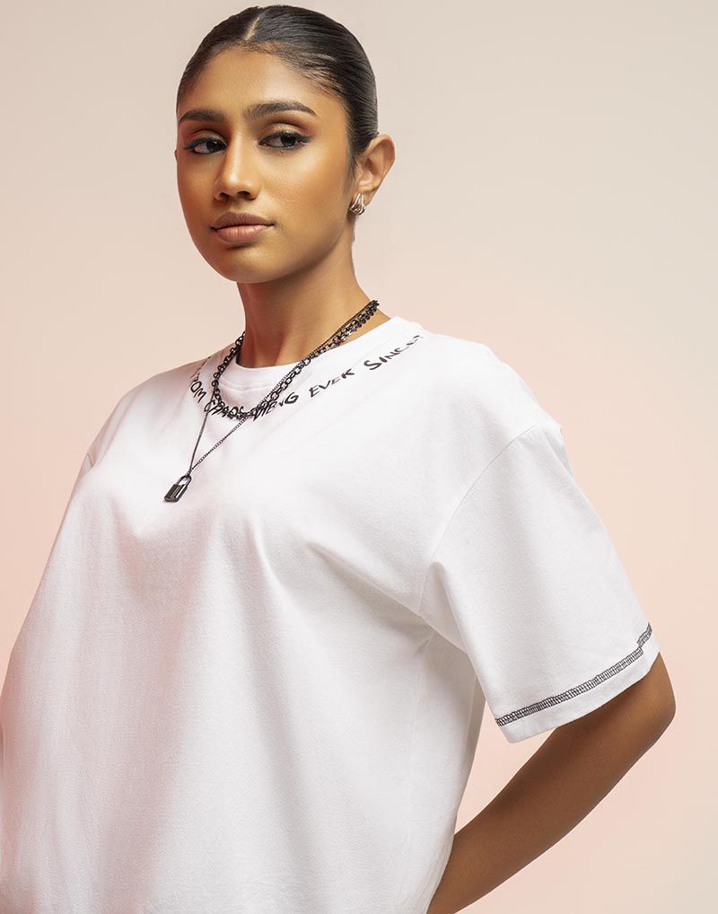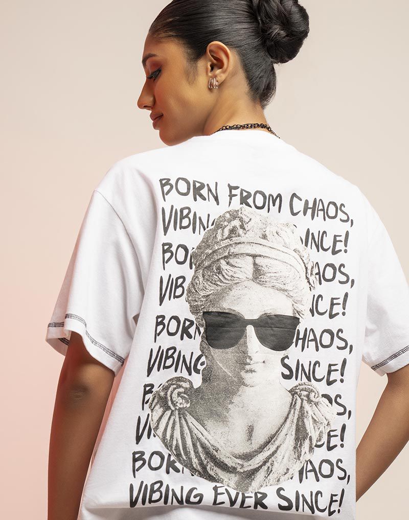 Make a statement with this bold graphic tee! The oversized t-shirt features a striking print of a classical statue with a modern, glitch-art twist. The "goddess energy" text adds a powerful and confident vibe. It's the perfect top to pair with anything for an effortlessly edgy look.