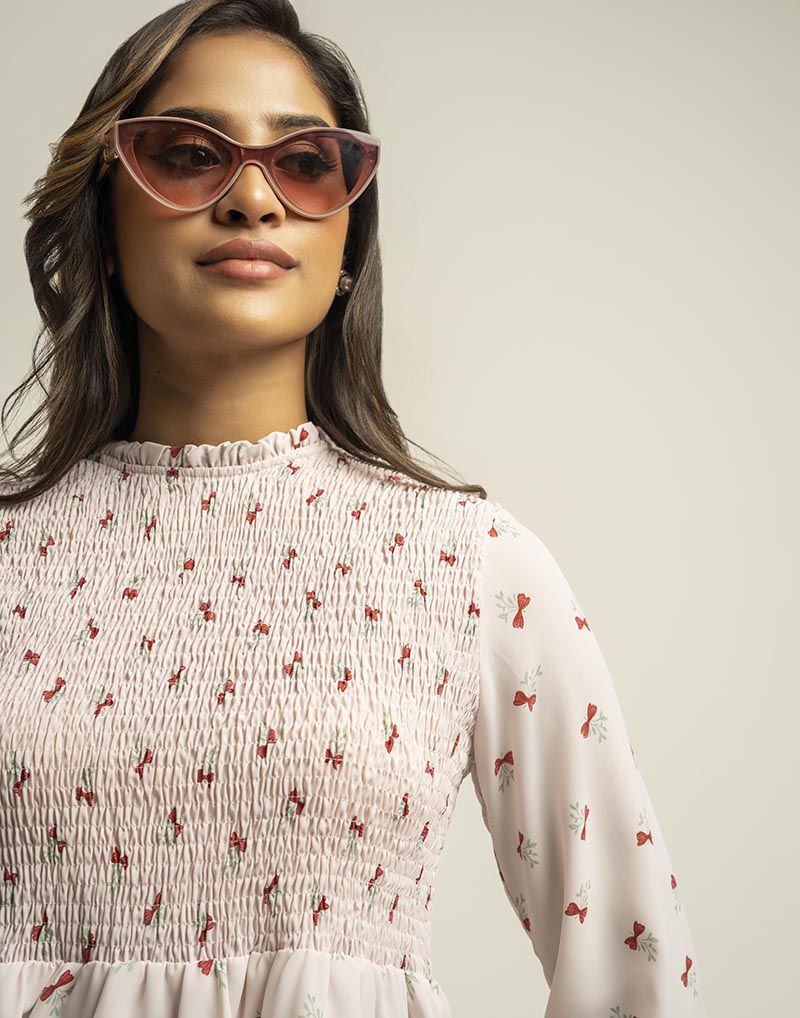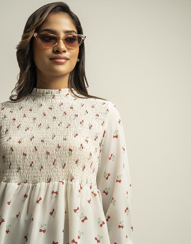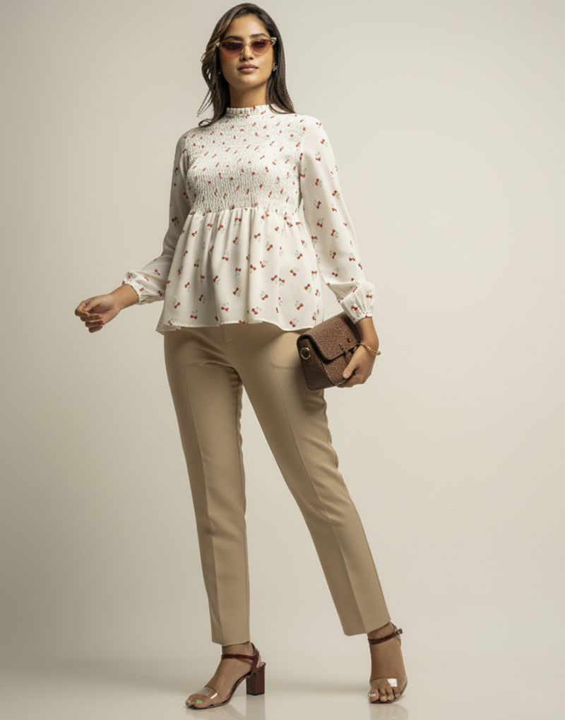 Achieve an effortlessly chic look with this smocked white blouse. The high neck and delicate texture add a modern touch to this classic silhouette, making it a perfect piece for your stylish wardrobe.