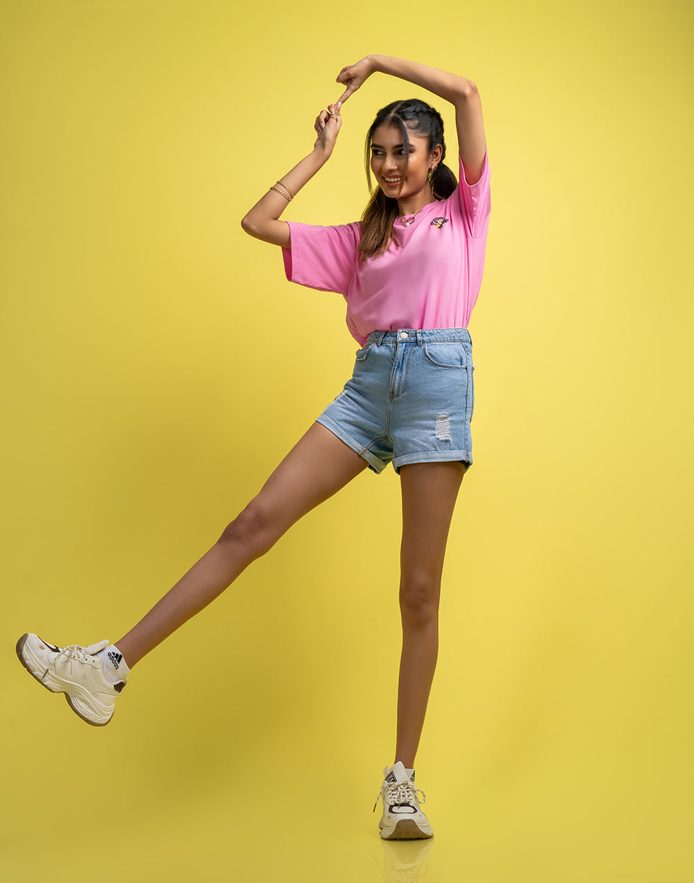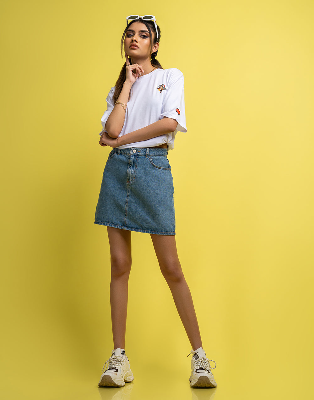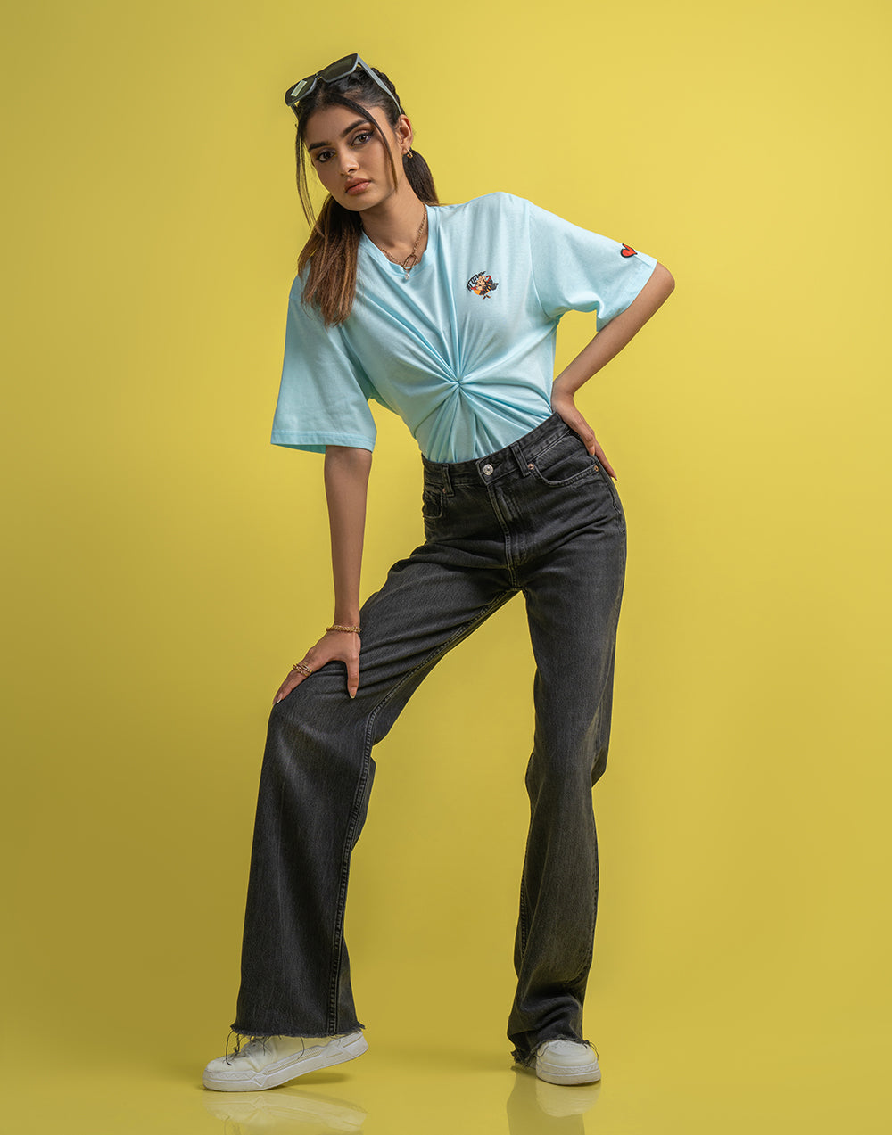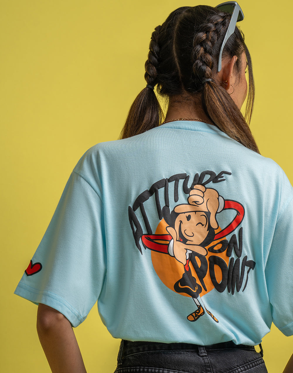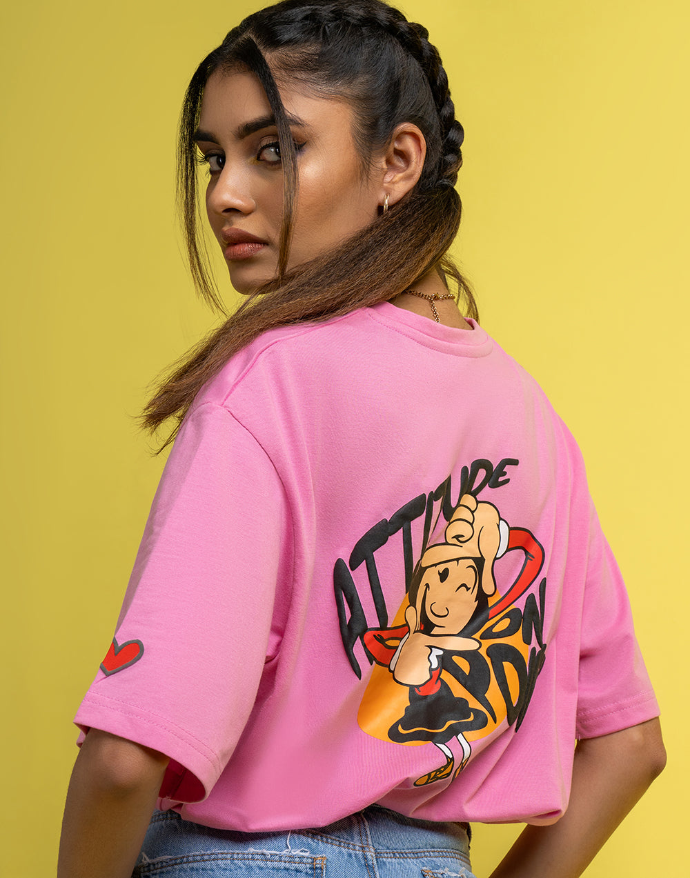 Oversized women’s T-shirt with striking graphic print, short sleeves, and a round neckline.