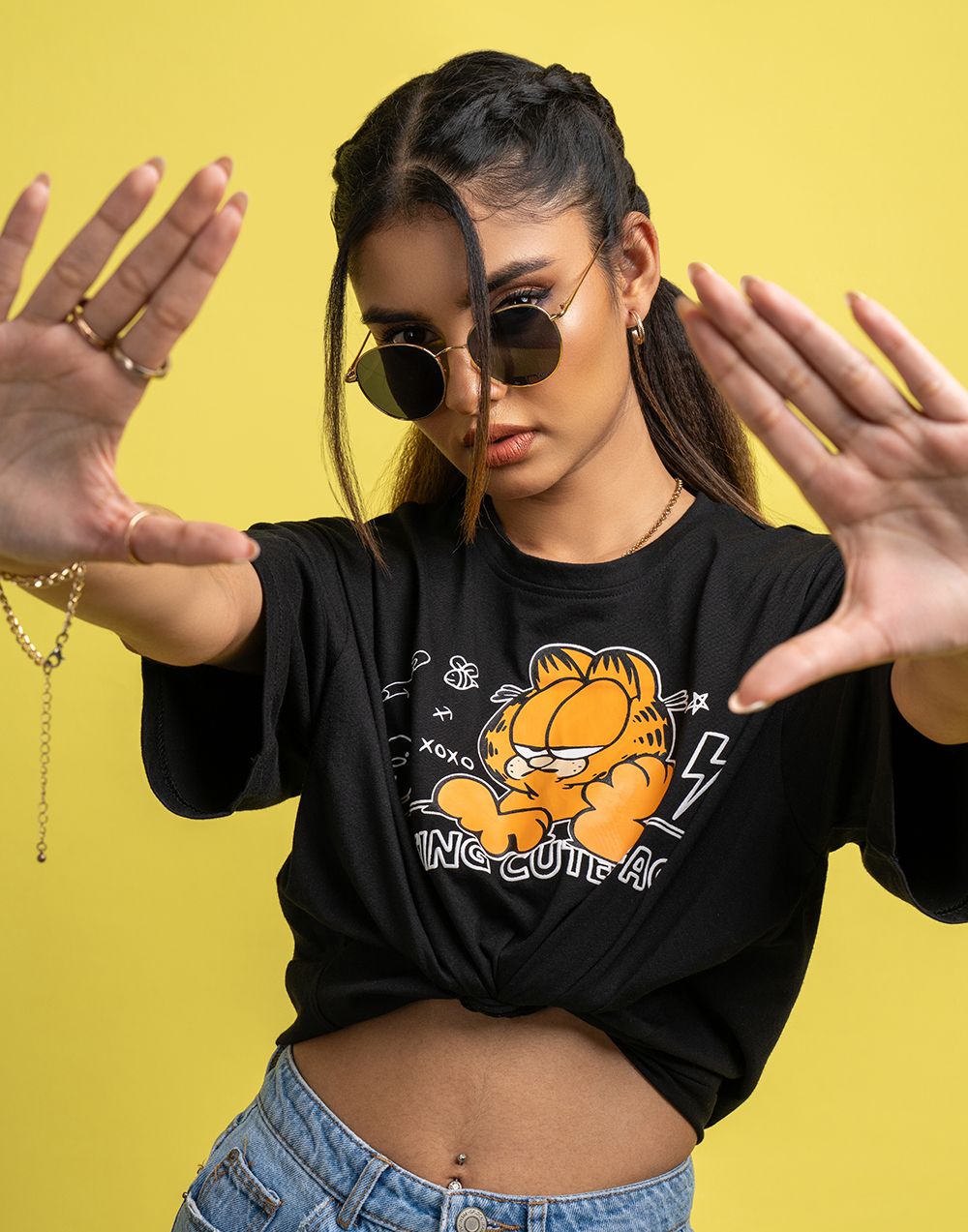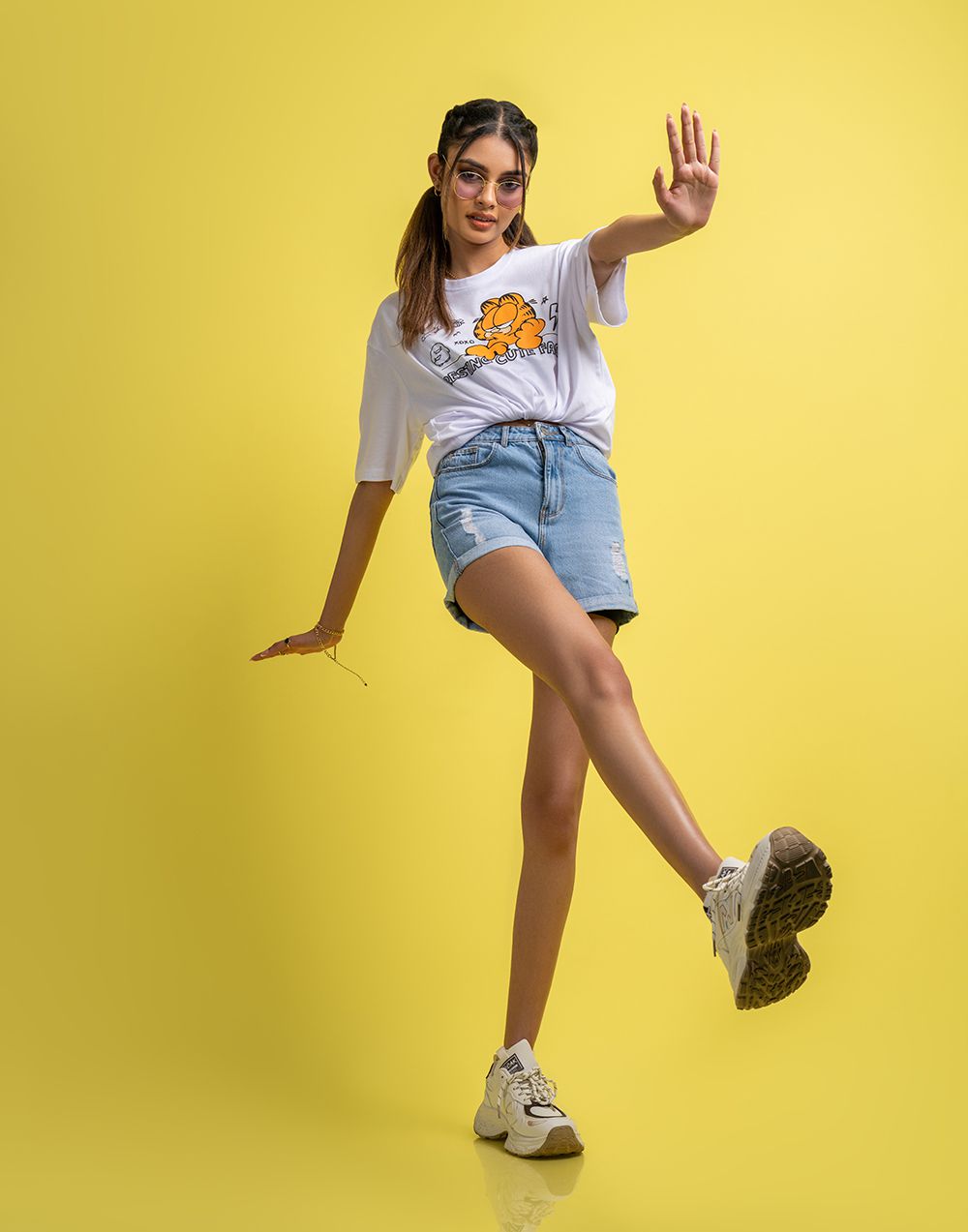 Oversized women’s T-shirt with striking graphic print, short sleeves, and a round neckline.