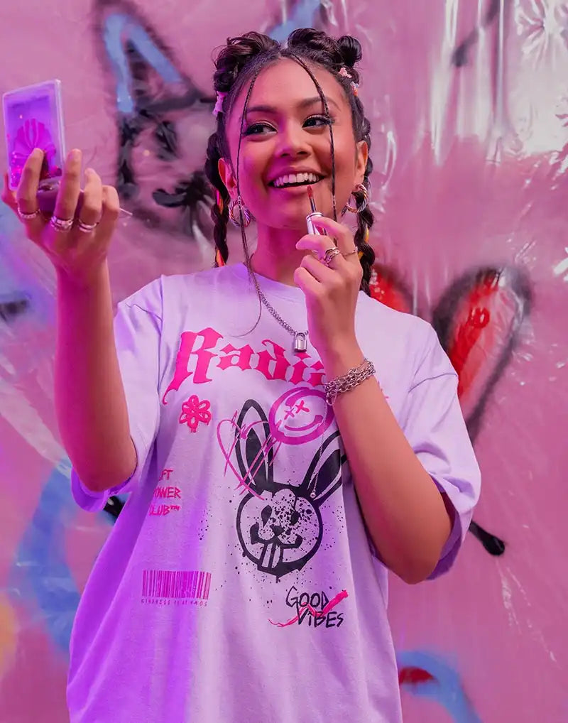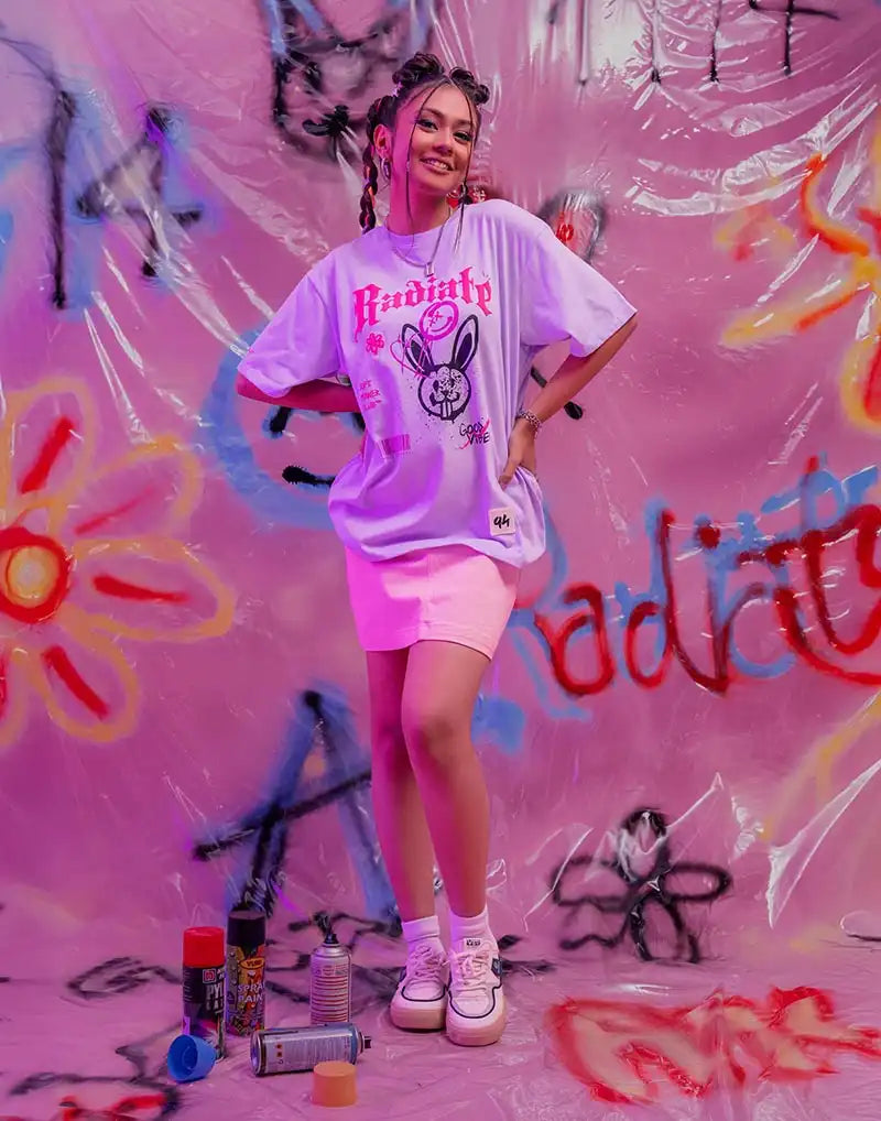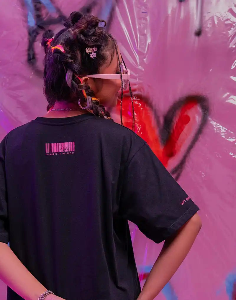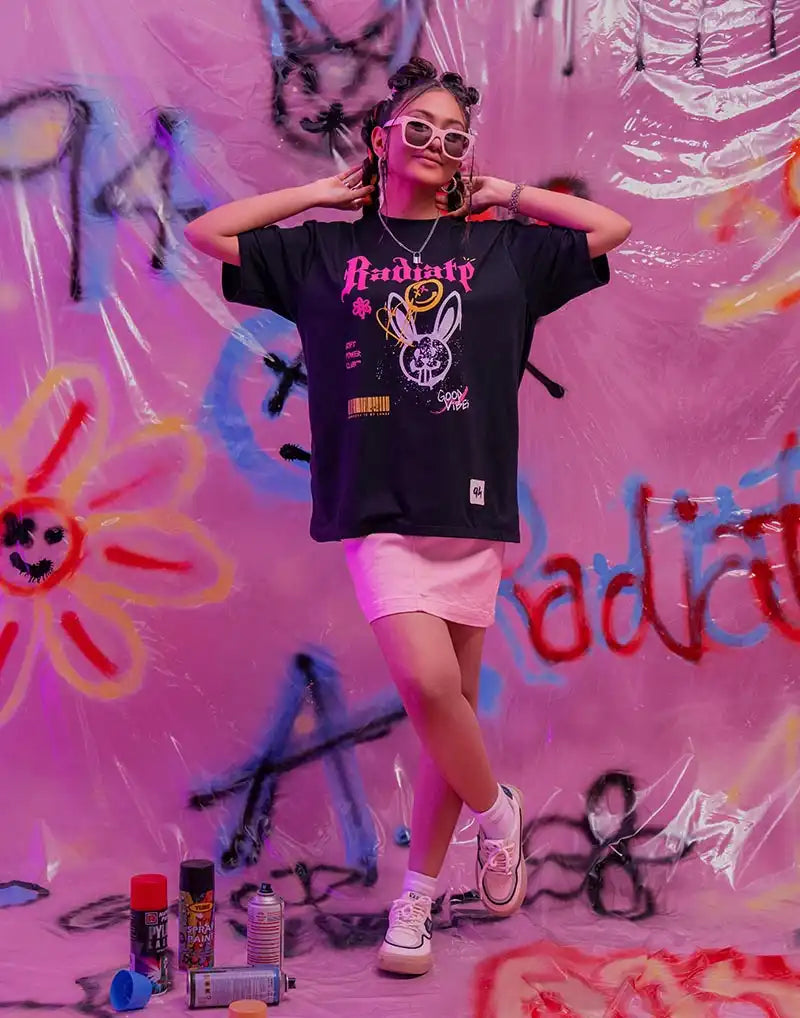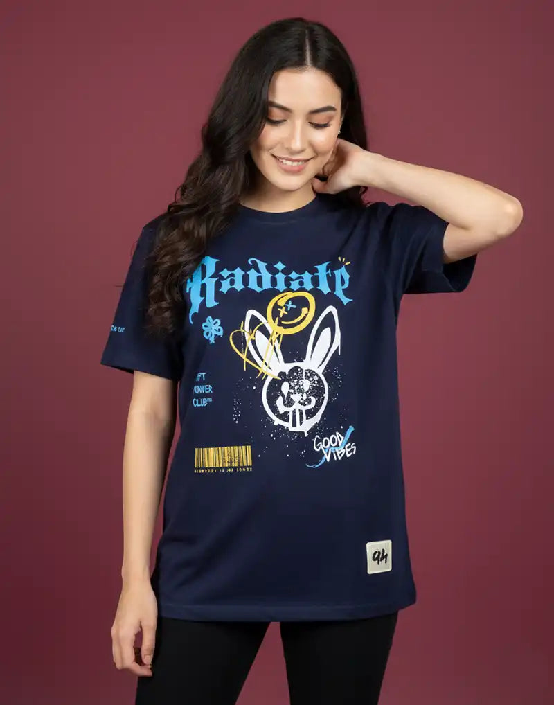 Oversized women’s T-shirt with striking print, short sleeves, and a round neckline.