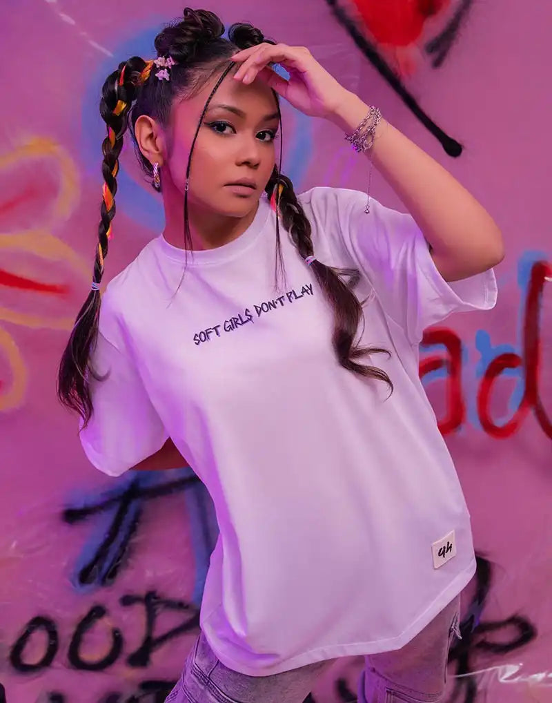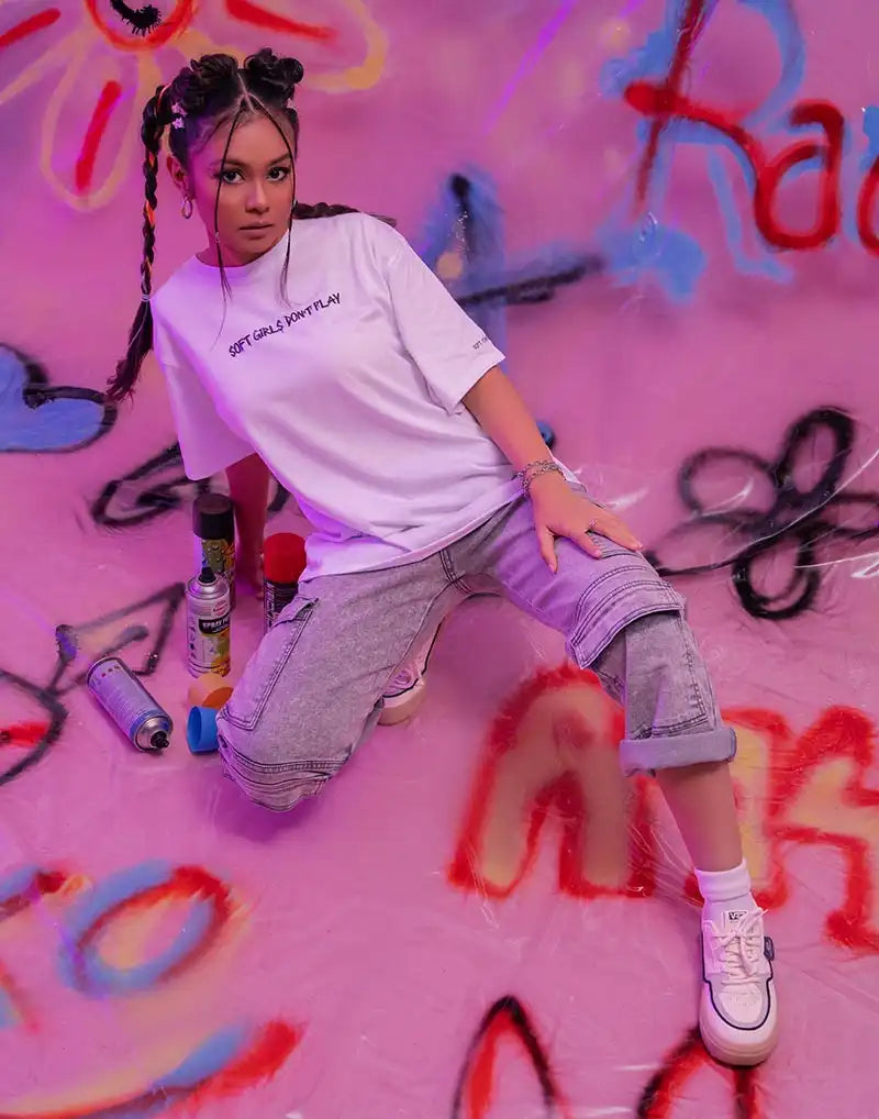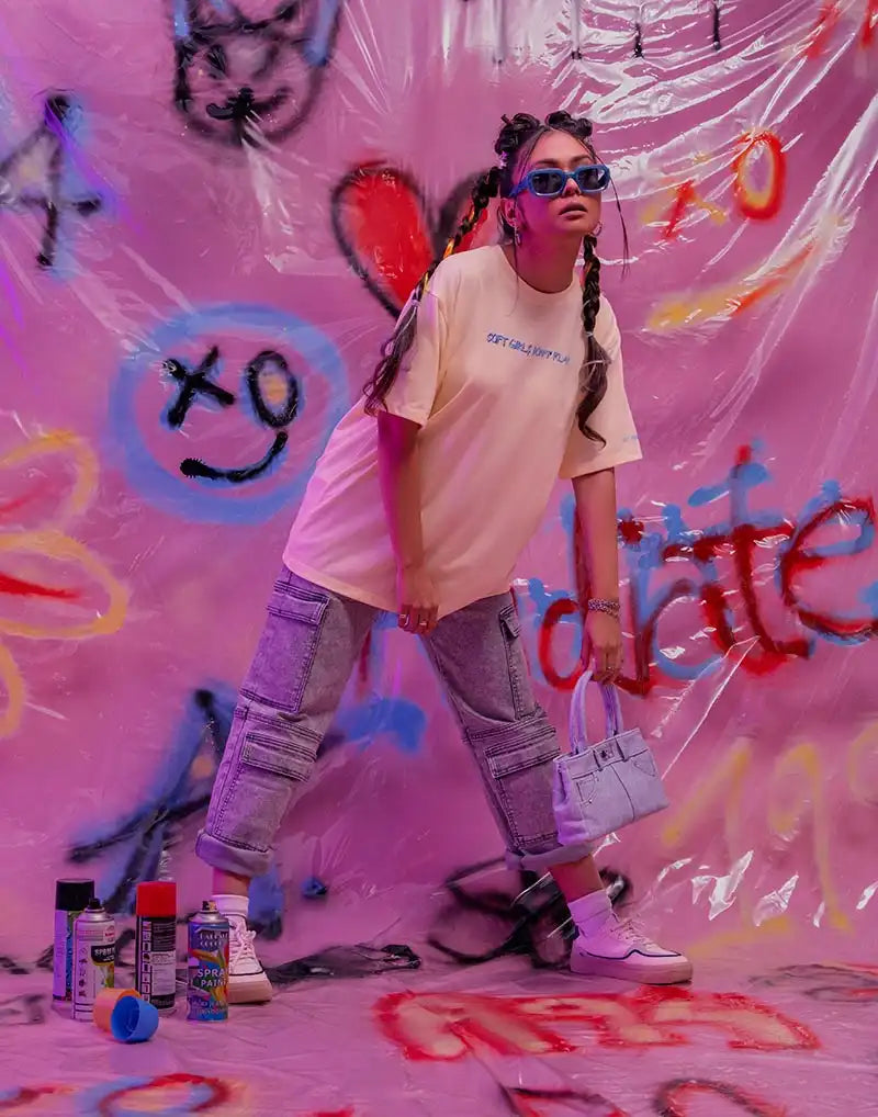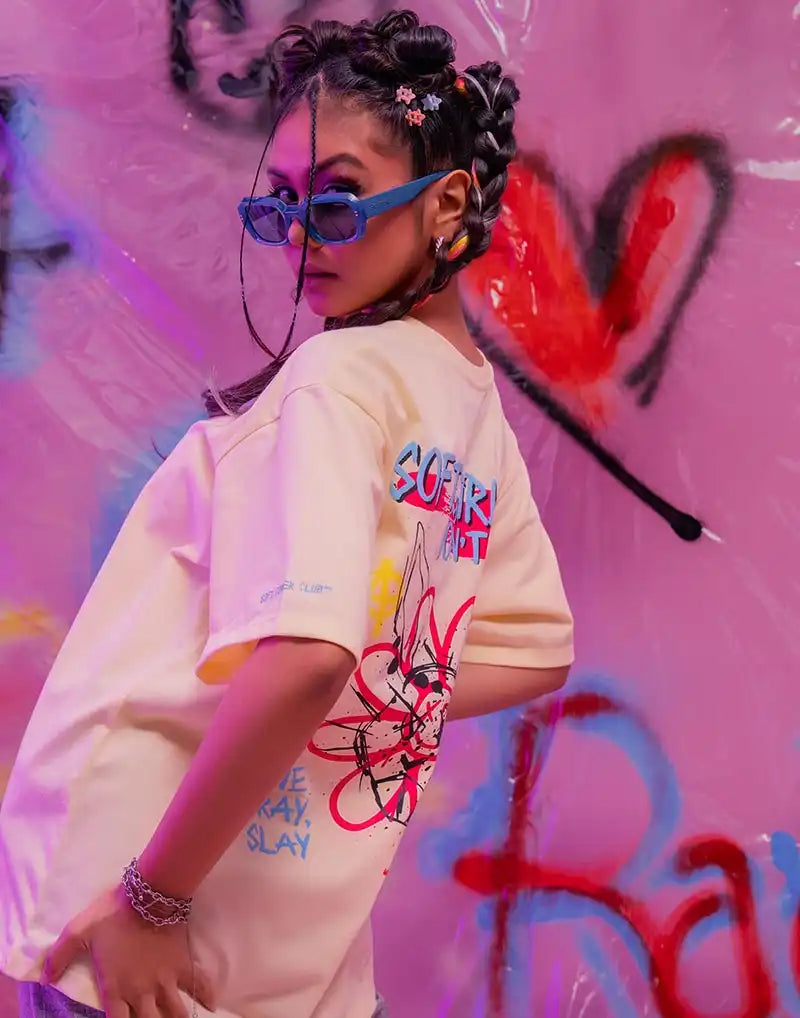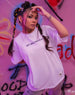 Oversized women’s T-shirt with striking print, short sleeves, and a round neckline.