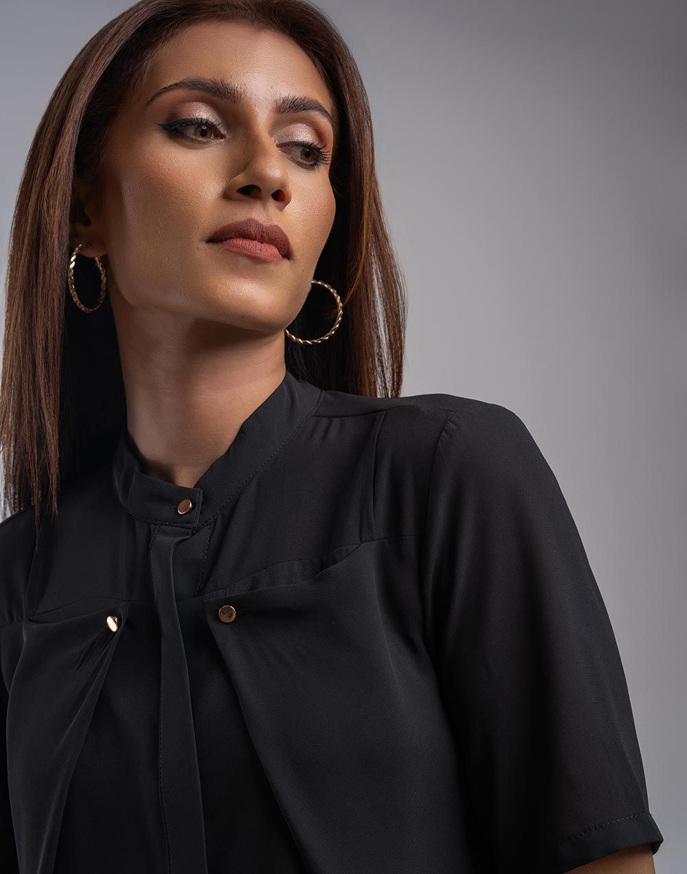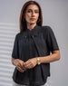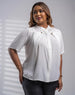 Elegant plain formal top featuring short sleeves and a full front button closure.