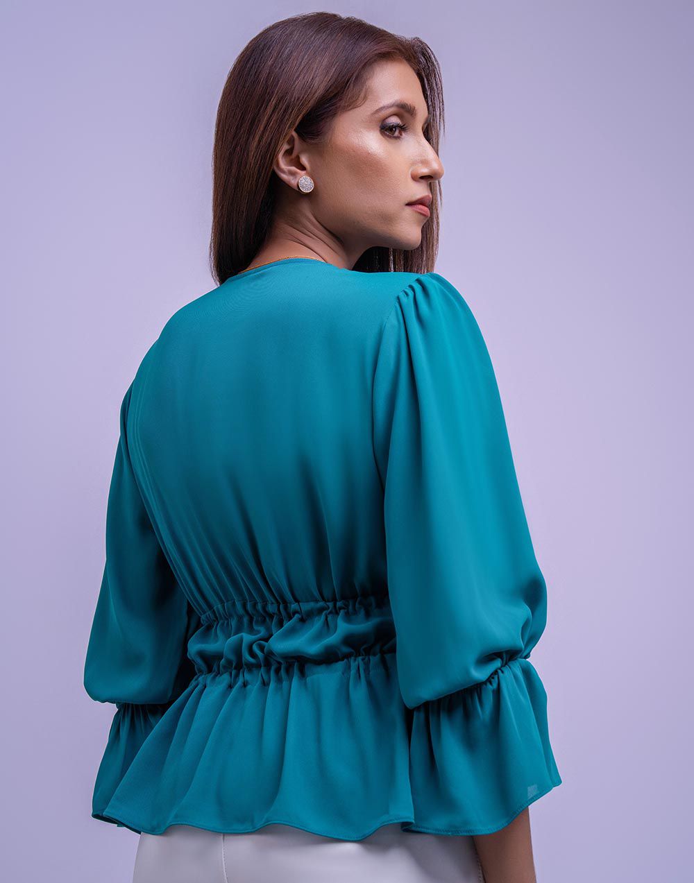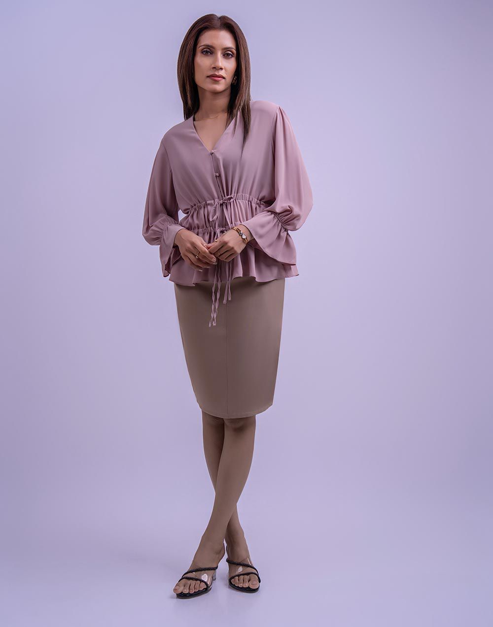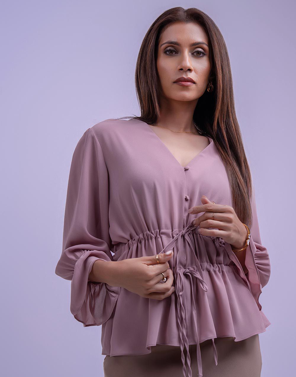 Designed with feminine charm, this top includes voluminous puff sleeves, a V-neck, front button detailing, and a tie waist for a customizable fit