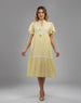 The textured midi dress. It features a high neckline with a stand-up collar and a tassel-tie detail. The bodice is accented with a square-shaped white lace trim. The dress has elbow-length, wide, ruffled sleeves. The skirt is tiered with a matching white lace trim separating the tiers, creating a flowy, A-line silhouette.