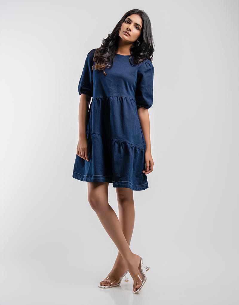 Effortlessly stylish, this denim dress features a tiered knee-length design, soft midi sleeves, and a timeless round neckline.
