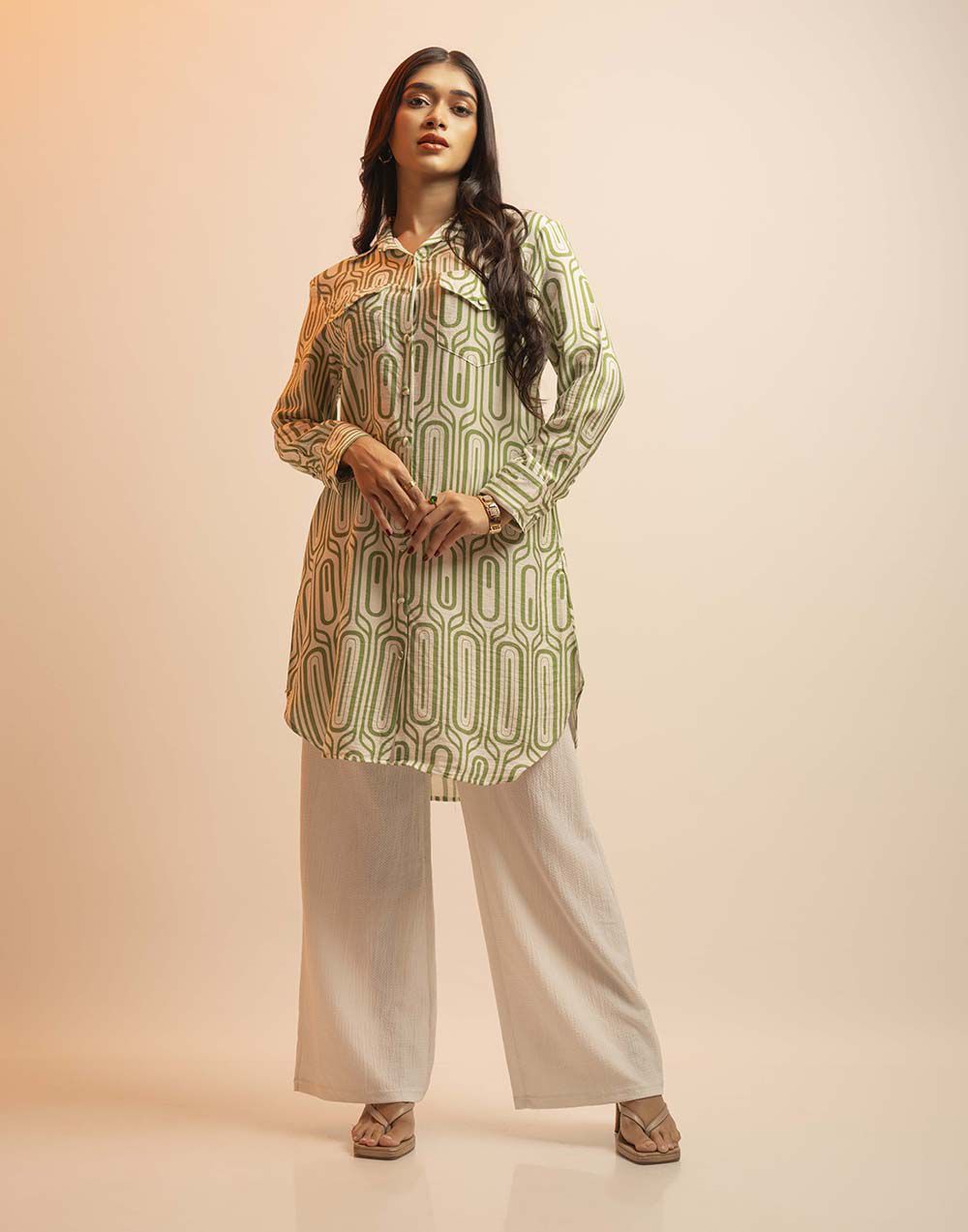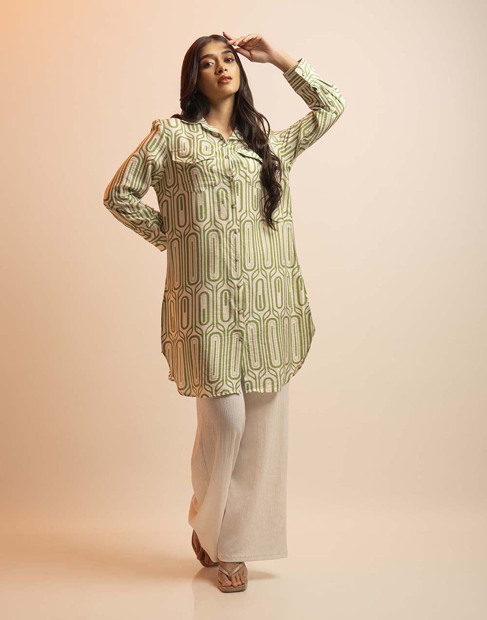 Long sleeve ornamental printed shirt dress with full front buttons fastening and side pockets .
