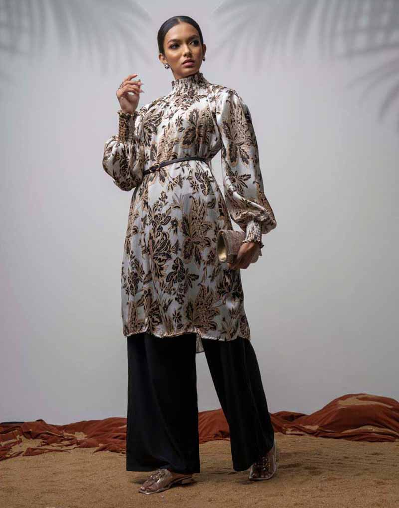 FLORAL PRINTED LONG SLEEVE SMOKED HIGH NECK LONG TOP.