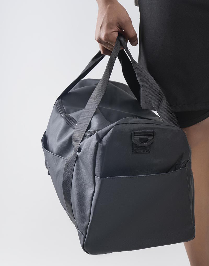 The bag is a charcoal gray or black duffel bag as indicated by the text on the shorts worn by the person holding it and the small logo on the bag itself. It has a structured, rectangular shape and is made from a durable, possibly waterproof, fabric.
