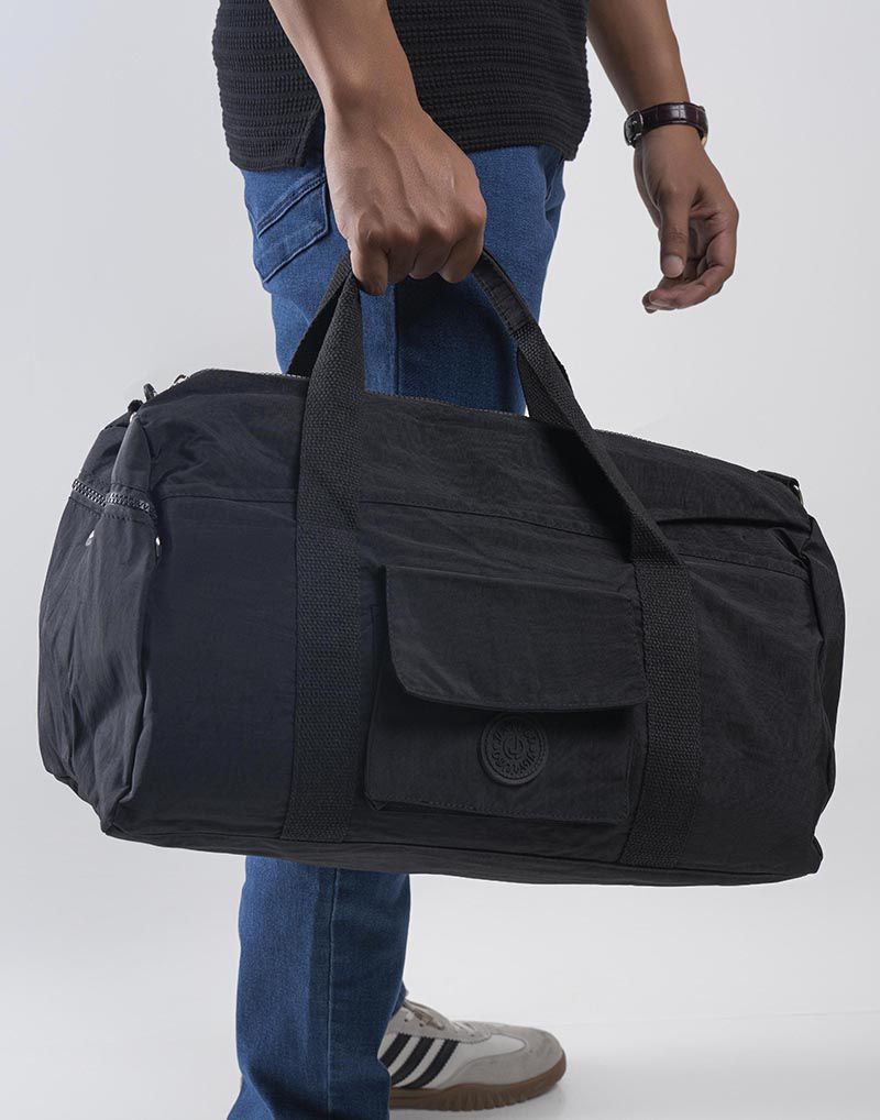 The bag is a plain duffel bag , It is made of a lightweight, nylon-like material and has a cylindrical shape with a zippered top closure. It features two handles for carrying and an adjustable, detachable shoulder strap. On the front, there is a large flap pocket with a small circular brand logo. There also appears to be a zippered pocket on the side. The bag is suitable for travel, the gym, or everyday use.
