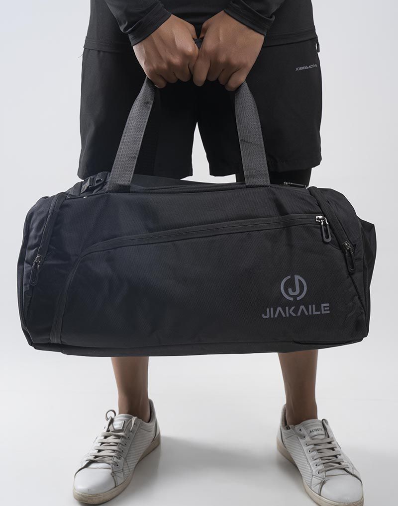The bag is a black duffel bag from the brand Jiakaile. It is designed for use as a gym, sports, or travel bag. It has a structured, rectangular shape with a subtle textured pattern on the fabric. The bag features two top handles and a zippered main compartment. There is a prominent logo on the front . The bag is described as being made from waterproof materials and may include features like a wet pocket and a separate shoe compartment, making it suitable for a variety of uses.