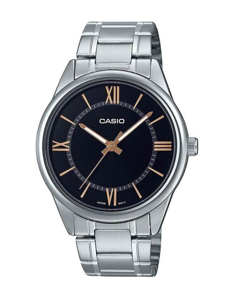 Style yourself for work or play with the MTP-V005 line of Casio dress watches. The simple, clean design of the face makes it easy to be on time. These versatile timepieces are water resistant for daily use, freeing you from worry when out in the rain or washing up.