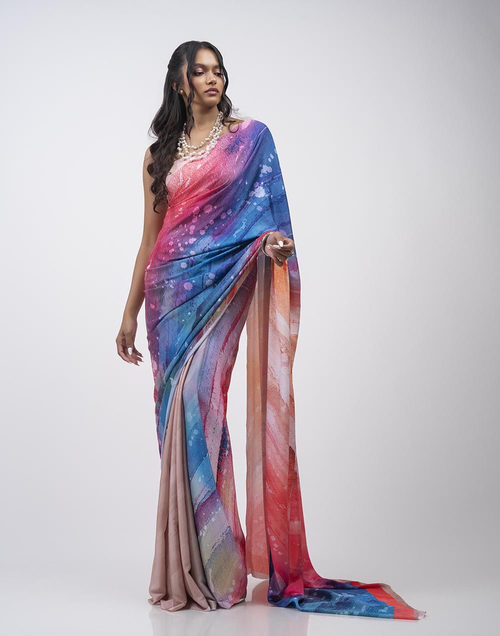 This printed batik silk saree Silk whispers stories of opulence and grandeur. Jacket piece included.