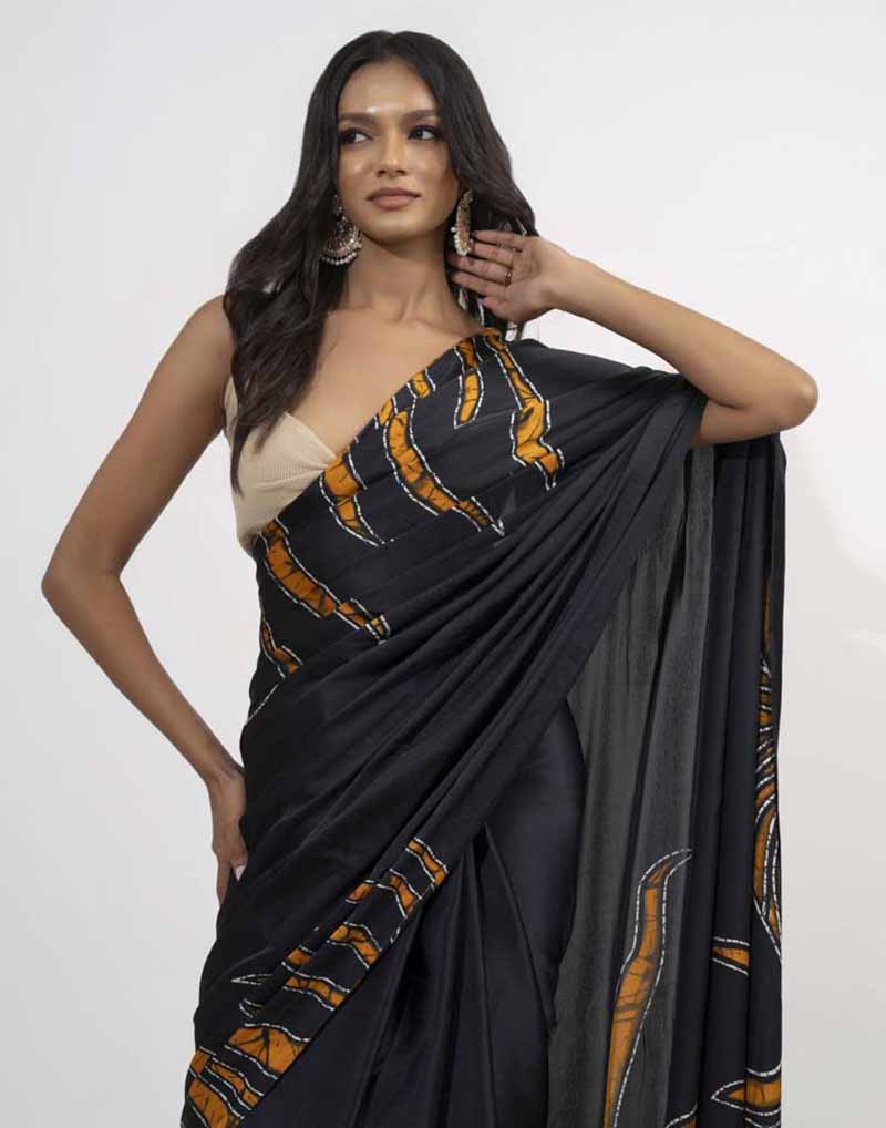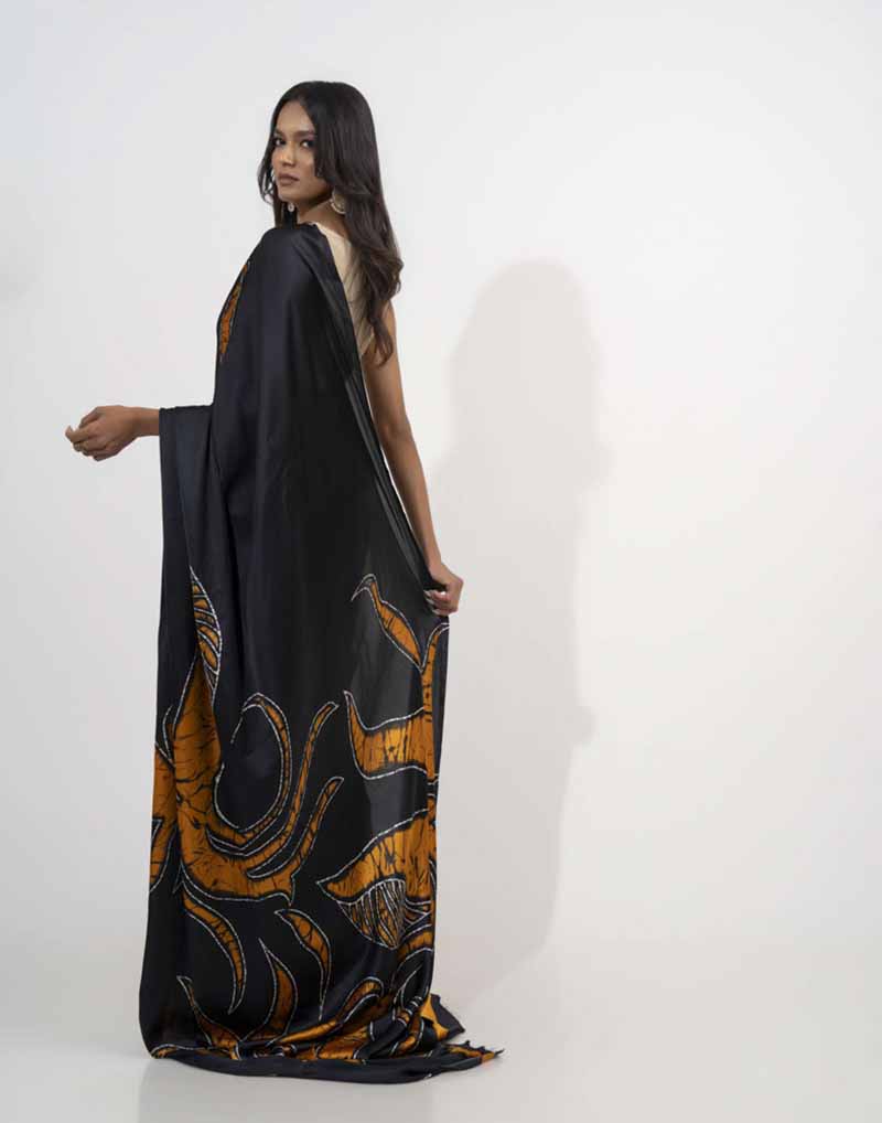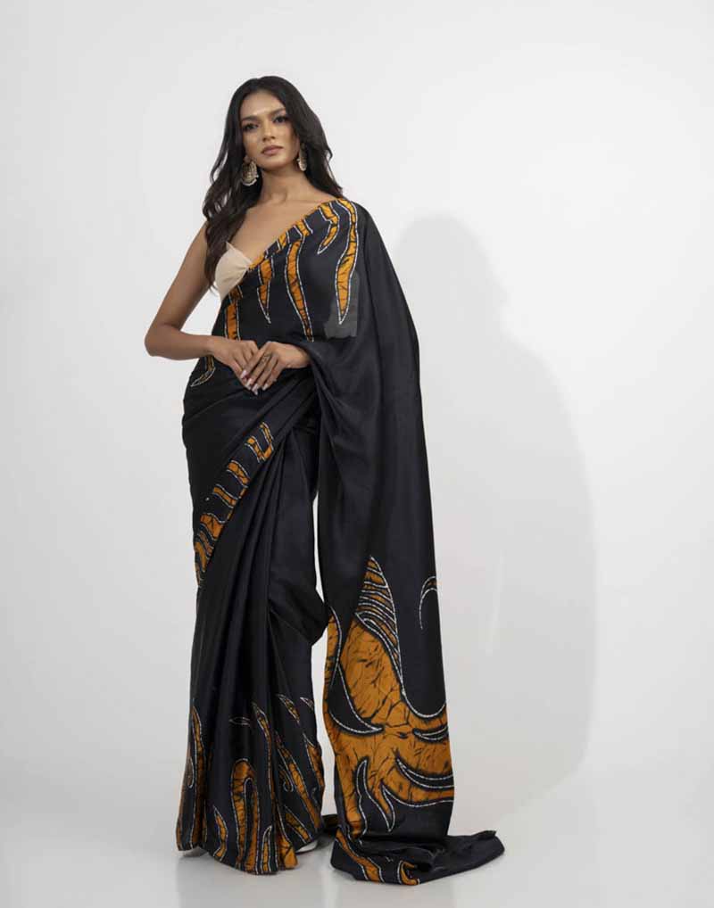 Experience timeless elegance in this printed batik silk saree — where every fold whispers stories of opulence and grace. Comes with a matching jacket piece.