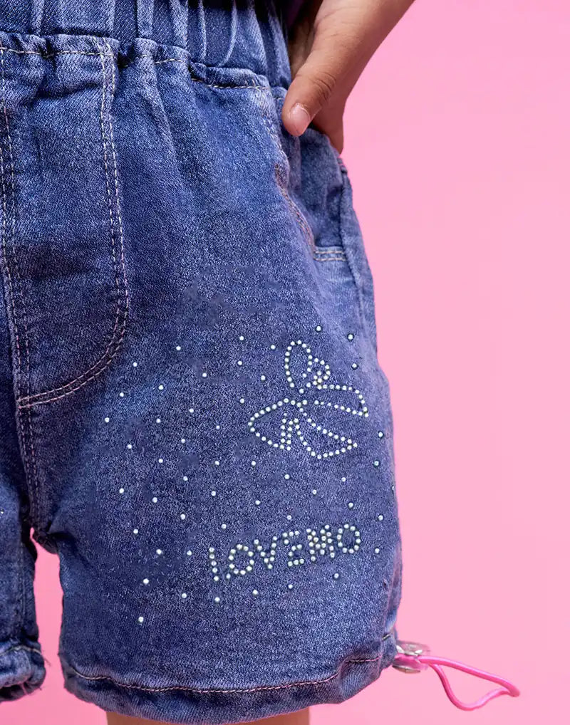 Girls embellished stretch denim shorts featuring side pockets and a front button and elastic waist band .