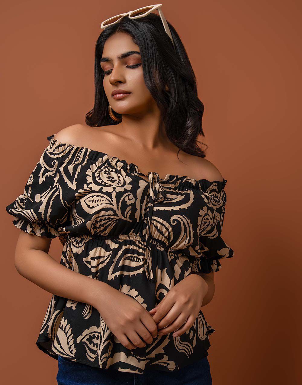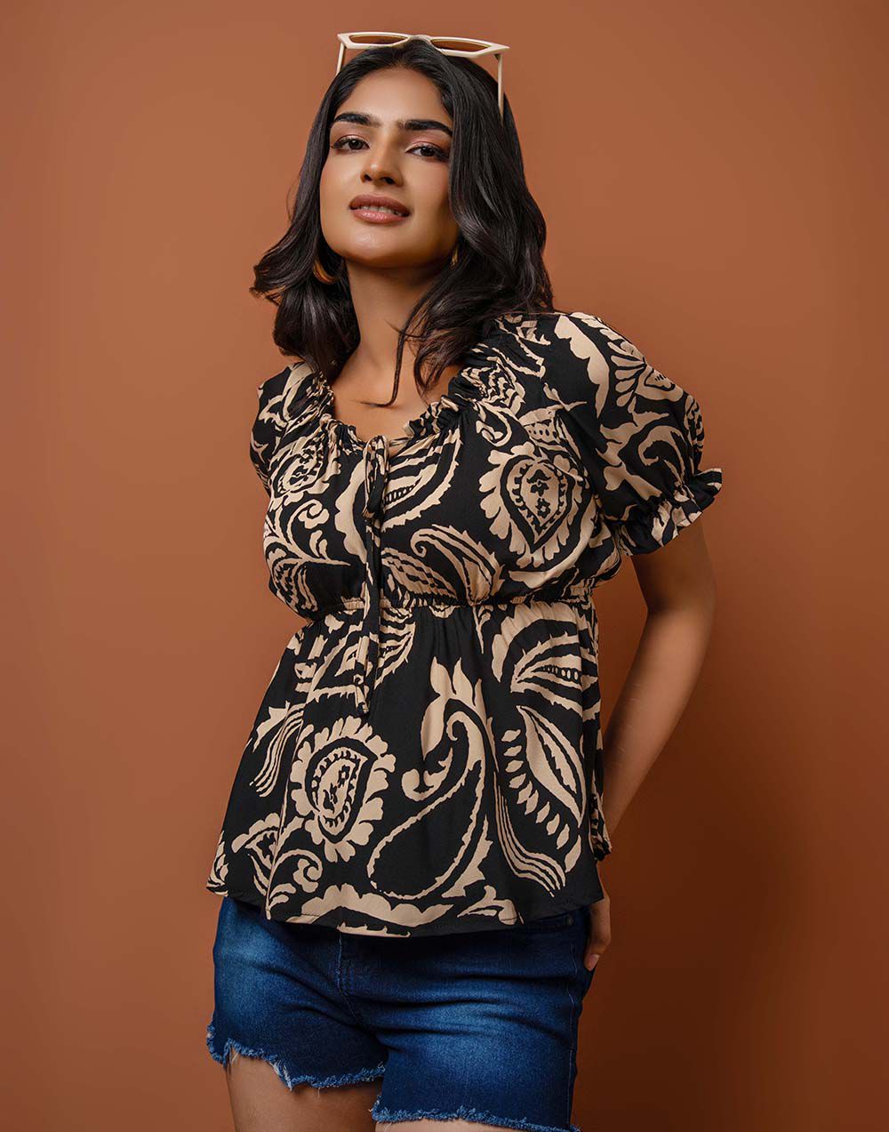 This casual top showcases charming short puff sleeves, a playful tie-up neckline, and a flattering gathered waist for effortless style.