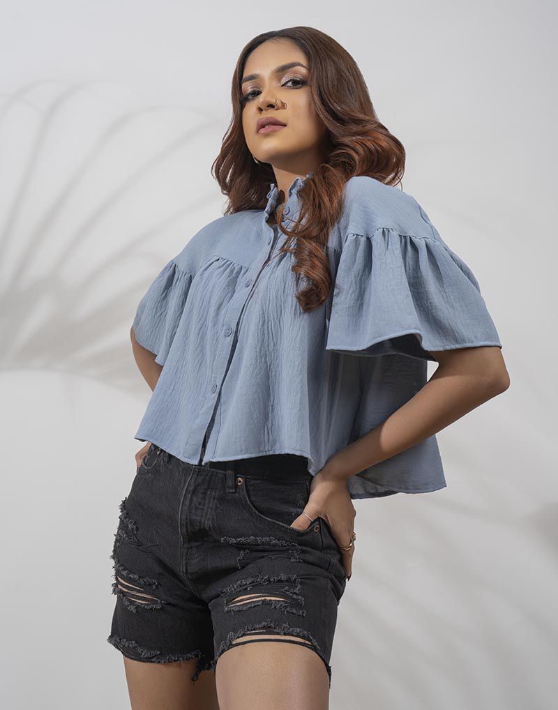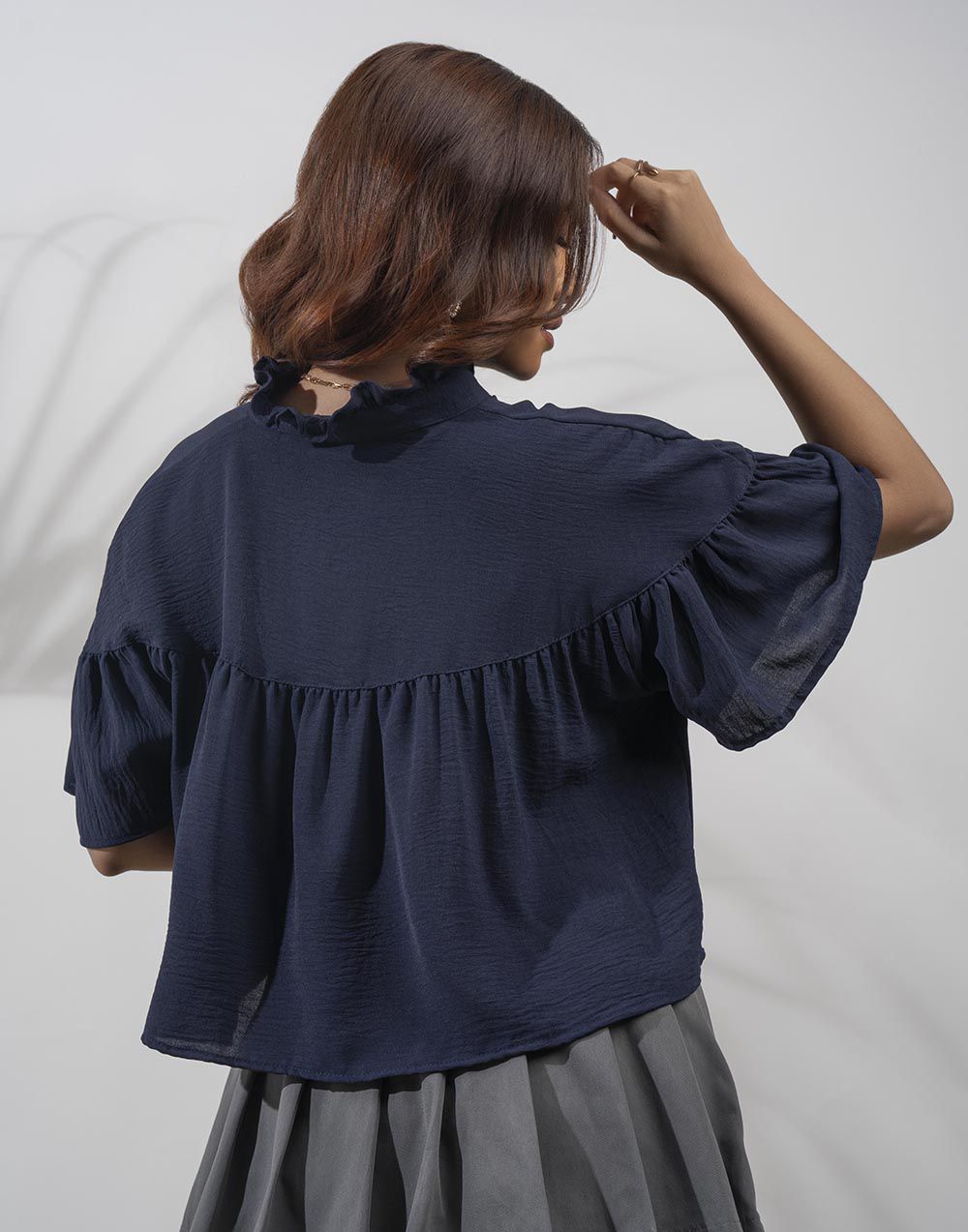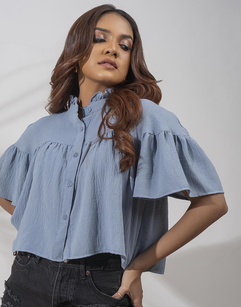 Chic oversized crop top with flared sleeves and a full-front button detail.