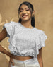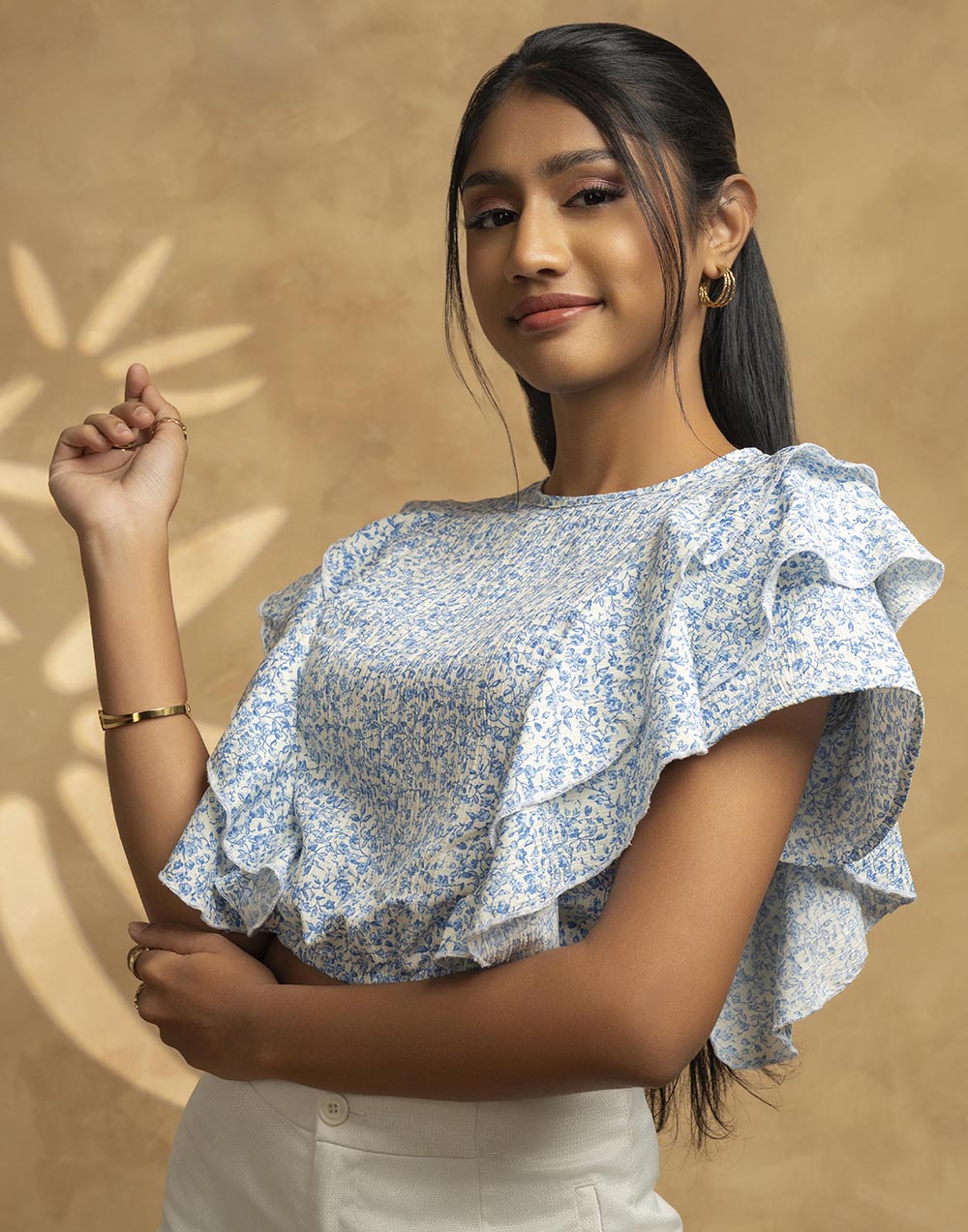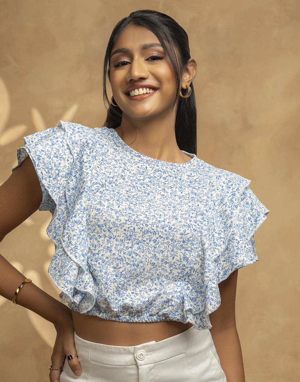 Breezy and beautiful, this floral-print frill-sleeve top features a flattering round neckline and a relaxed silhouette. Crafted from airy fabric, it's perfect for pairing with high-waisted skirt or a flowy skirt.