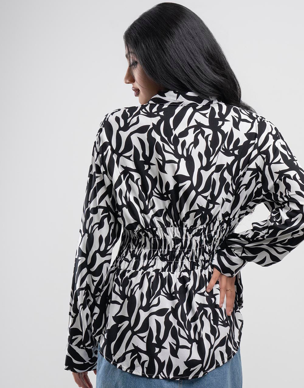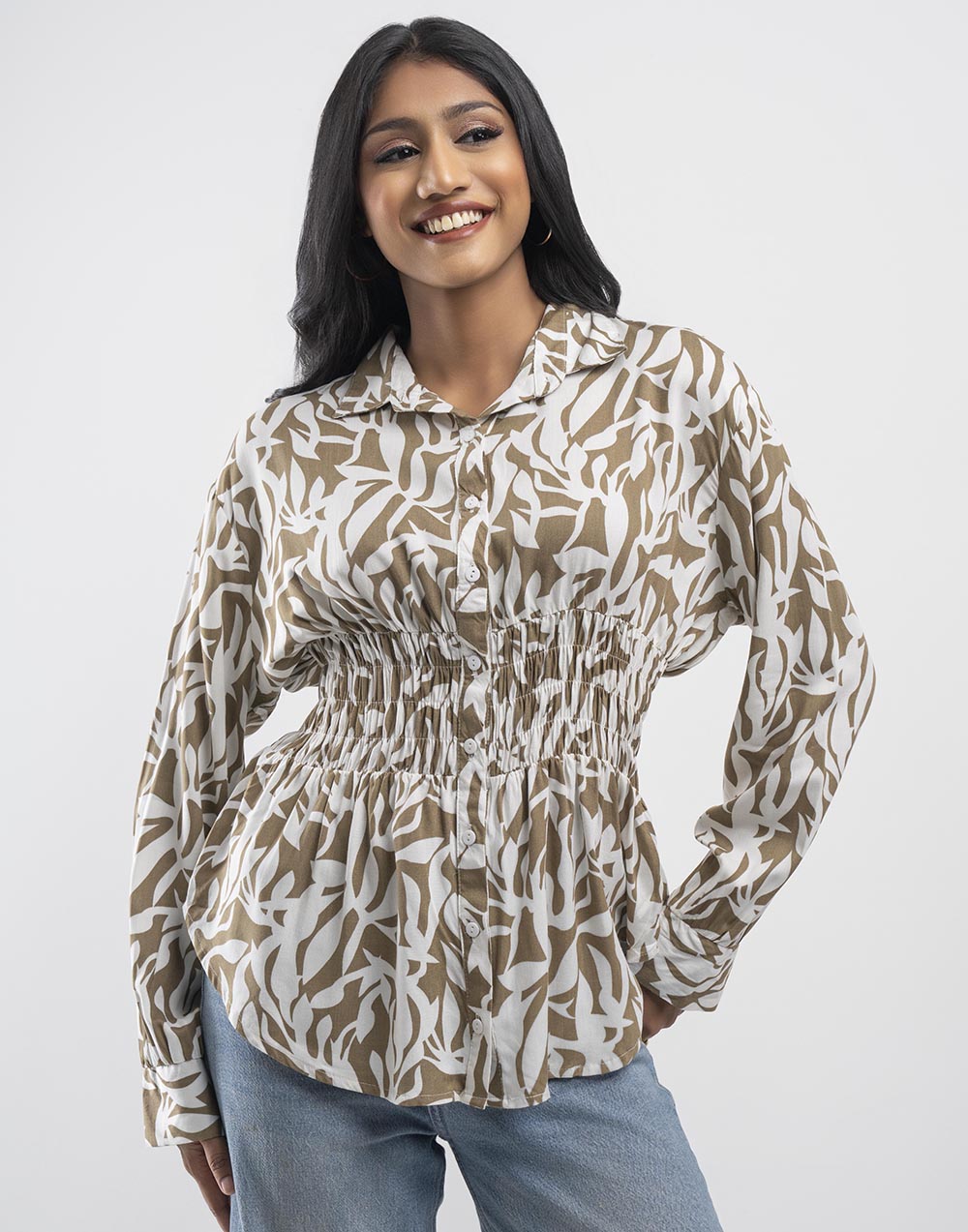 Soft, stylish, and easy to wear — this printed cotton top is your go-to for everyday charm. It features breezy long sleeves and front buttons-down design, finished with smoked waist for the perfect fit.
