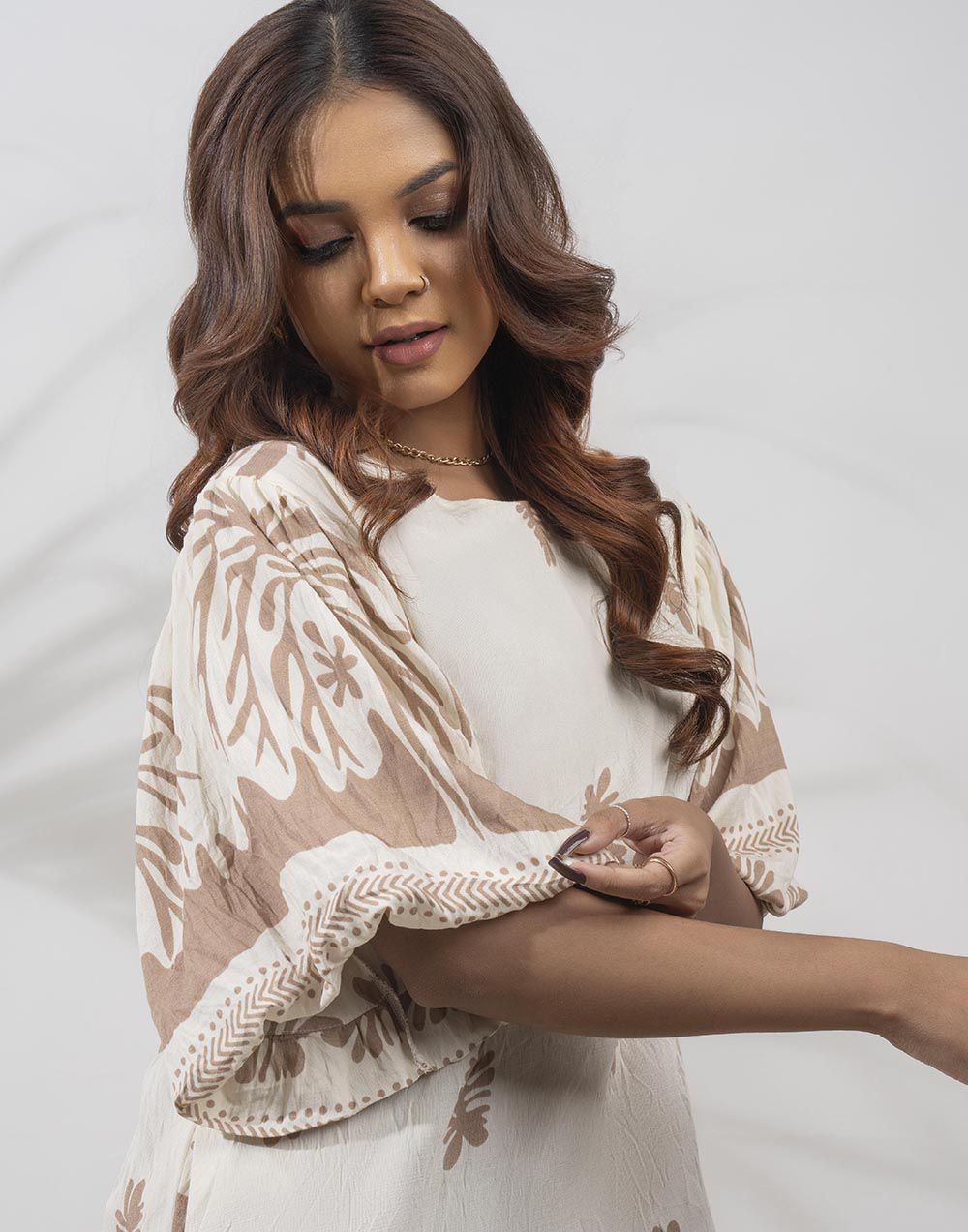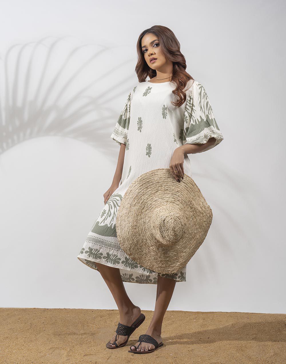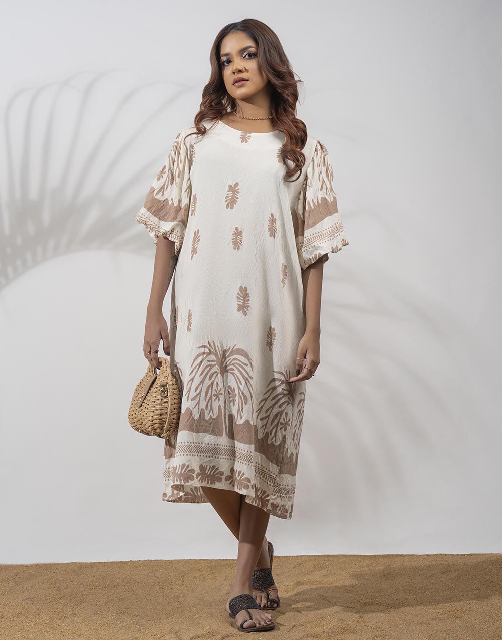 Midi-length oversized dress in printed fabric, designed with short balloon sleeves and a round neck.