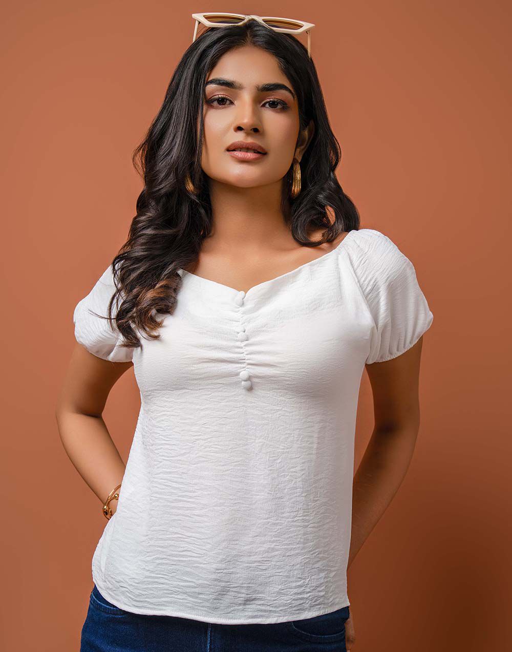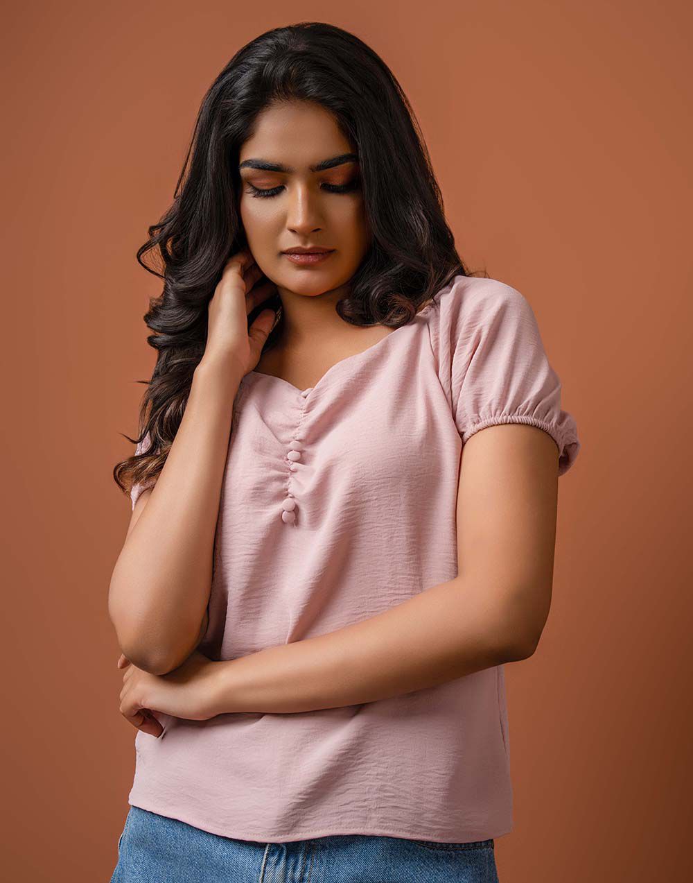 A charming casual top with a flattering regular fit, delicate short puff sleeves, a V-neckline, and six button details down the front.