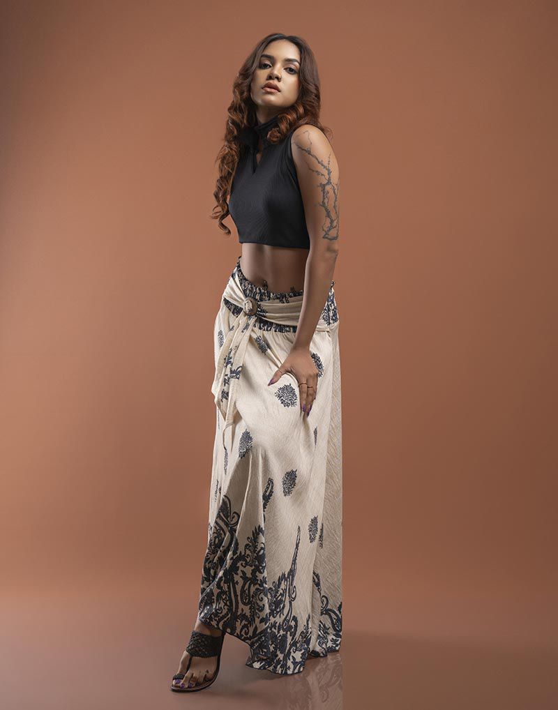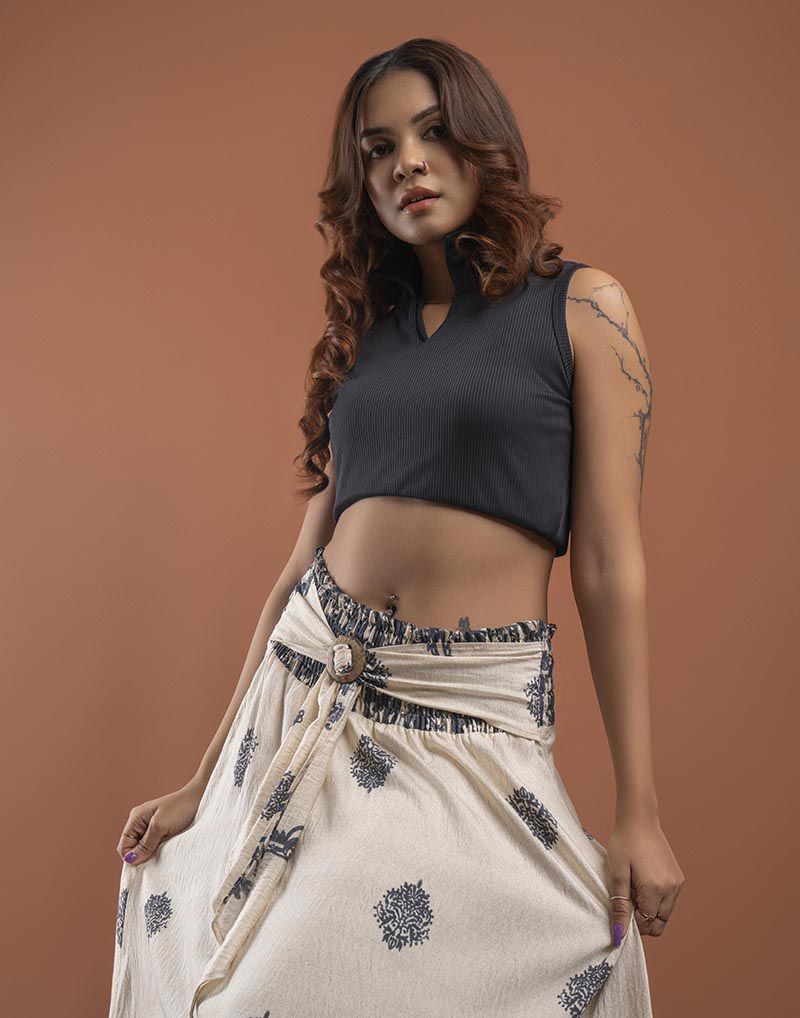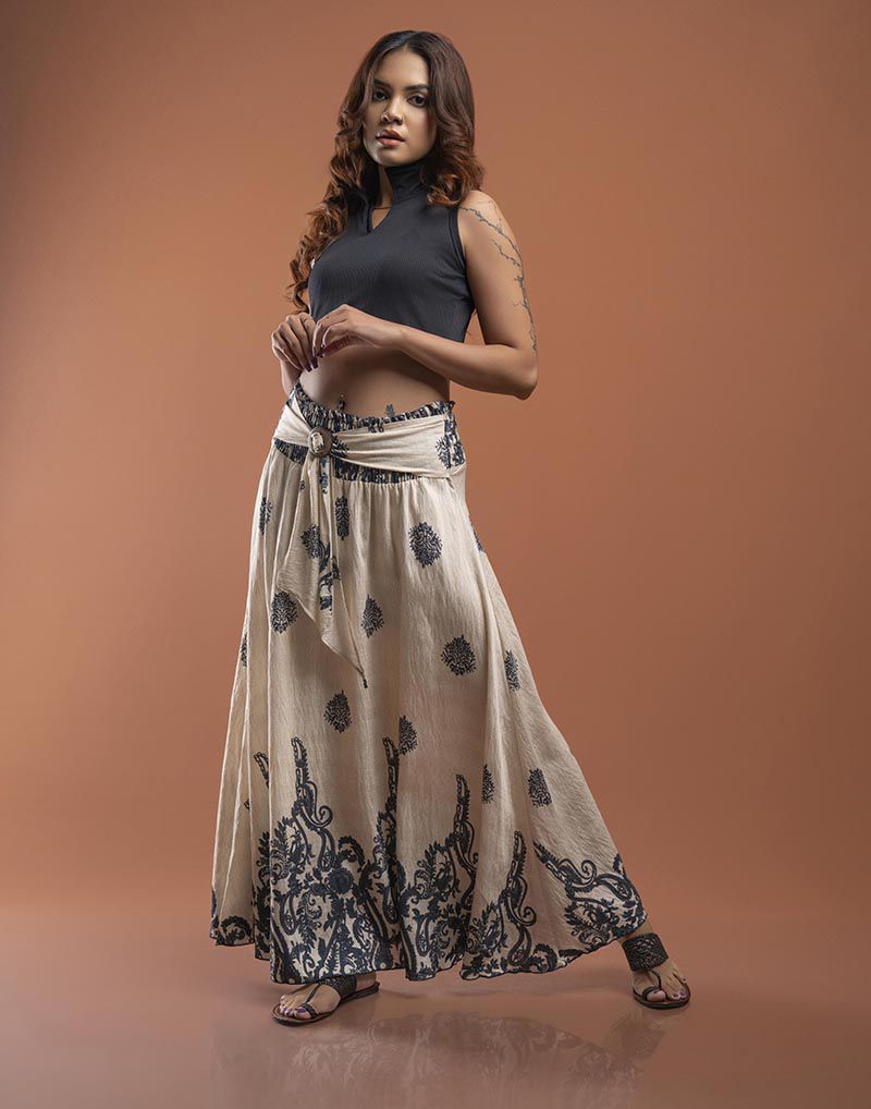 Flowy printed maxi skirt designed with a stretchy elastic waist and a chic front belt to accentuate your silhouette.