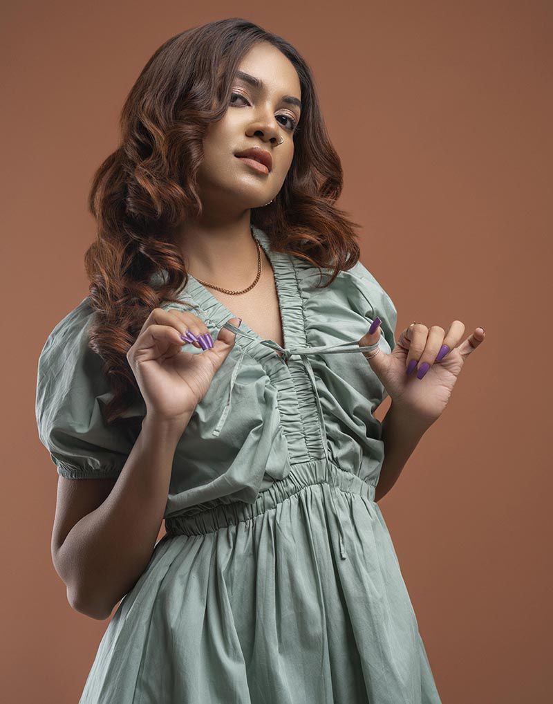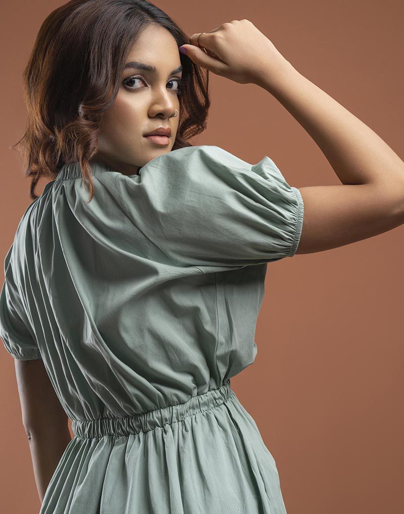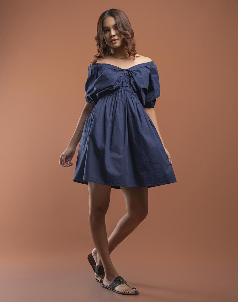 This plain, above-the-knee dress features soft short puff sleeves and a comfortable elastic V-neckline, perfect for casual or semi-formal occasions.