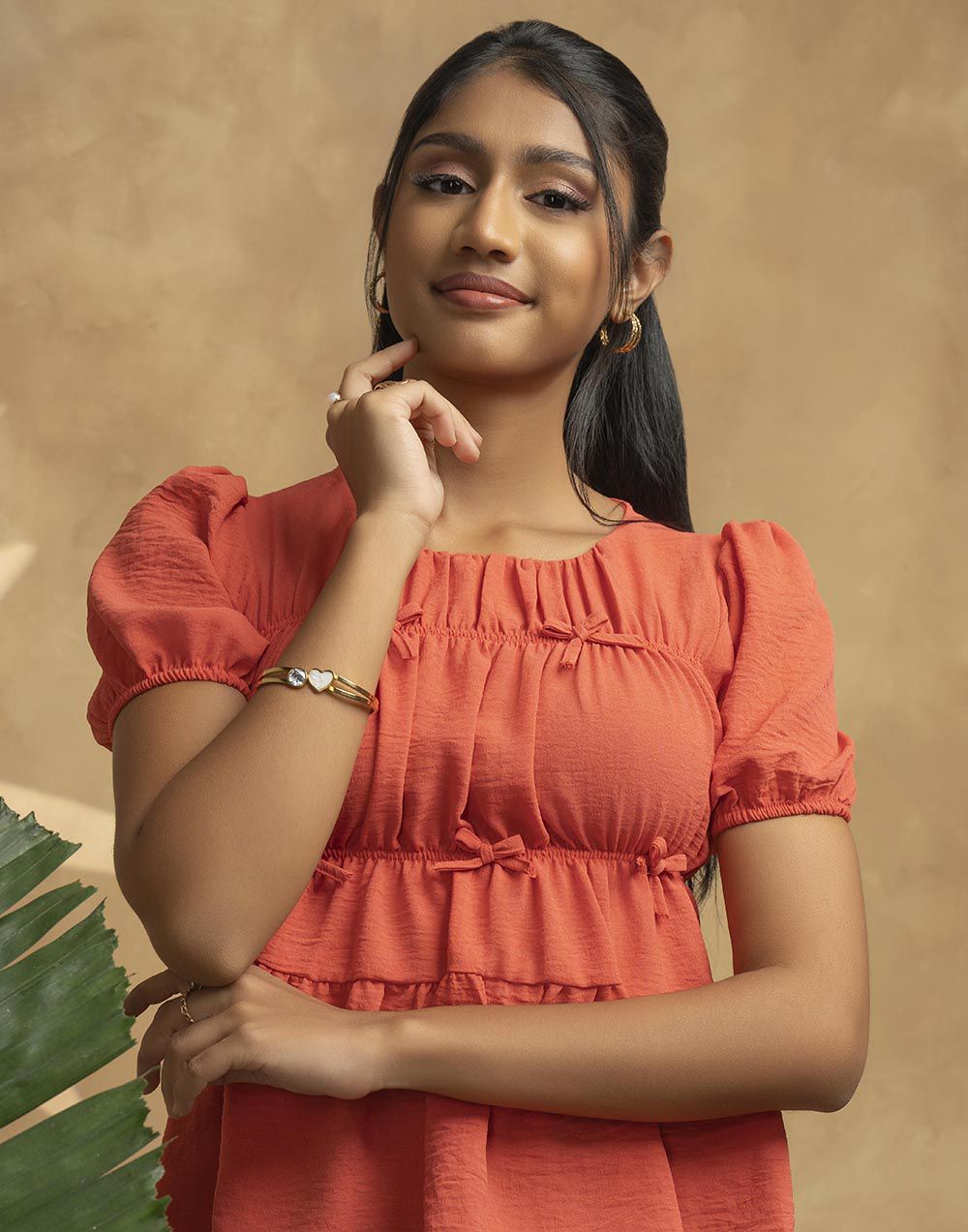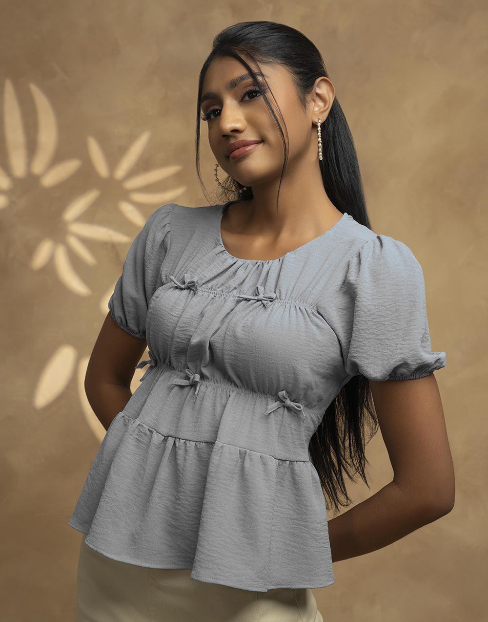 A short-sleeve gathered top featuring a front bow fastening.
