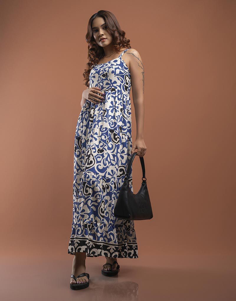Effortlessly romantic, this printed tiered maxi dress features delicate spaghetti straps and a smocked back for a flexible, figure-hugging fit.