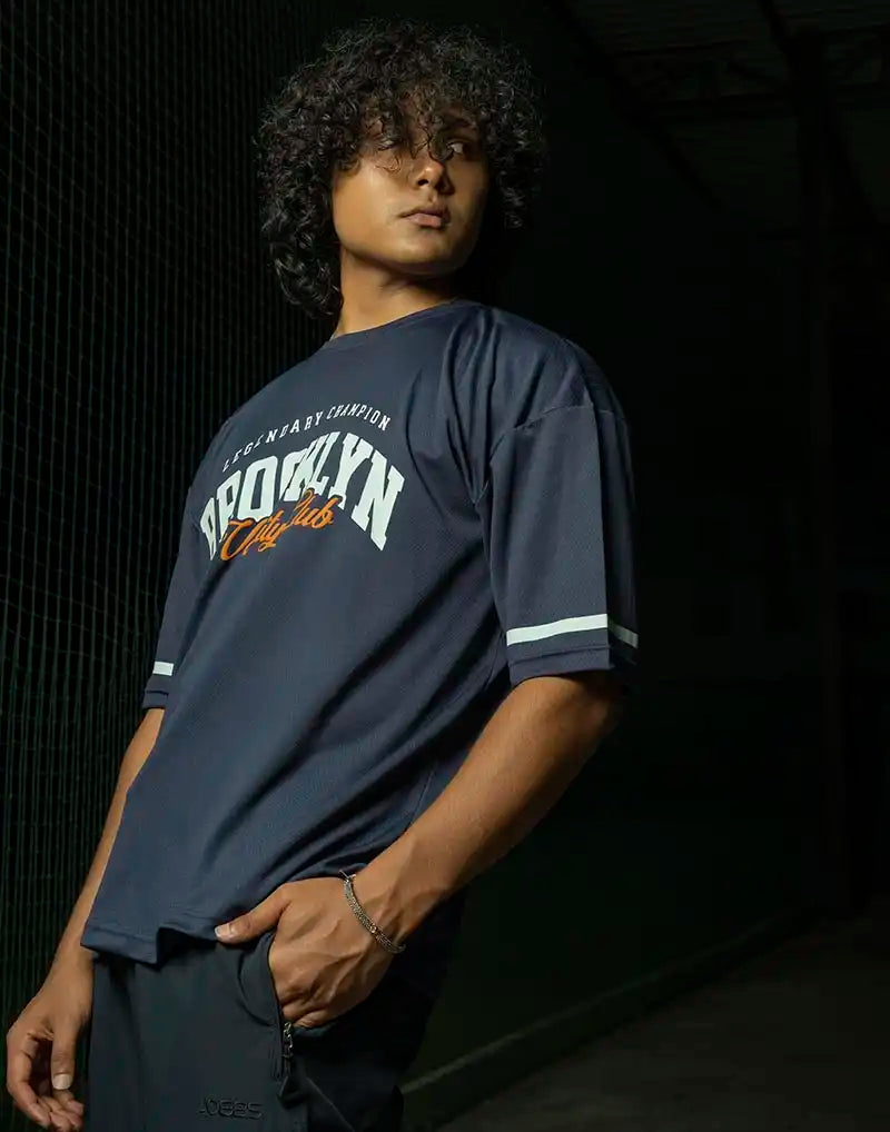 A varsity oversized graphic T-shirt featuring short sleeves and a classic round neckline, designed for a relaxed and casual fit.