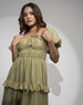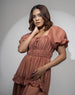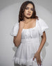 Chic and charming, this midi-length dress features short puff sleeves, a softly layered skirt, and a tie-up neckline for a playful yet elegant finish. Ideal for garden parties, brunches, or casual occasions.
