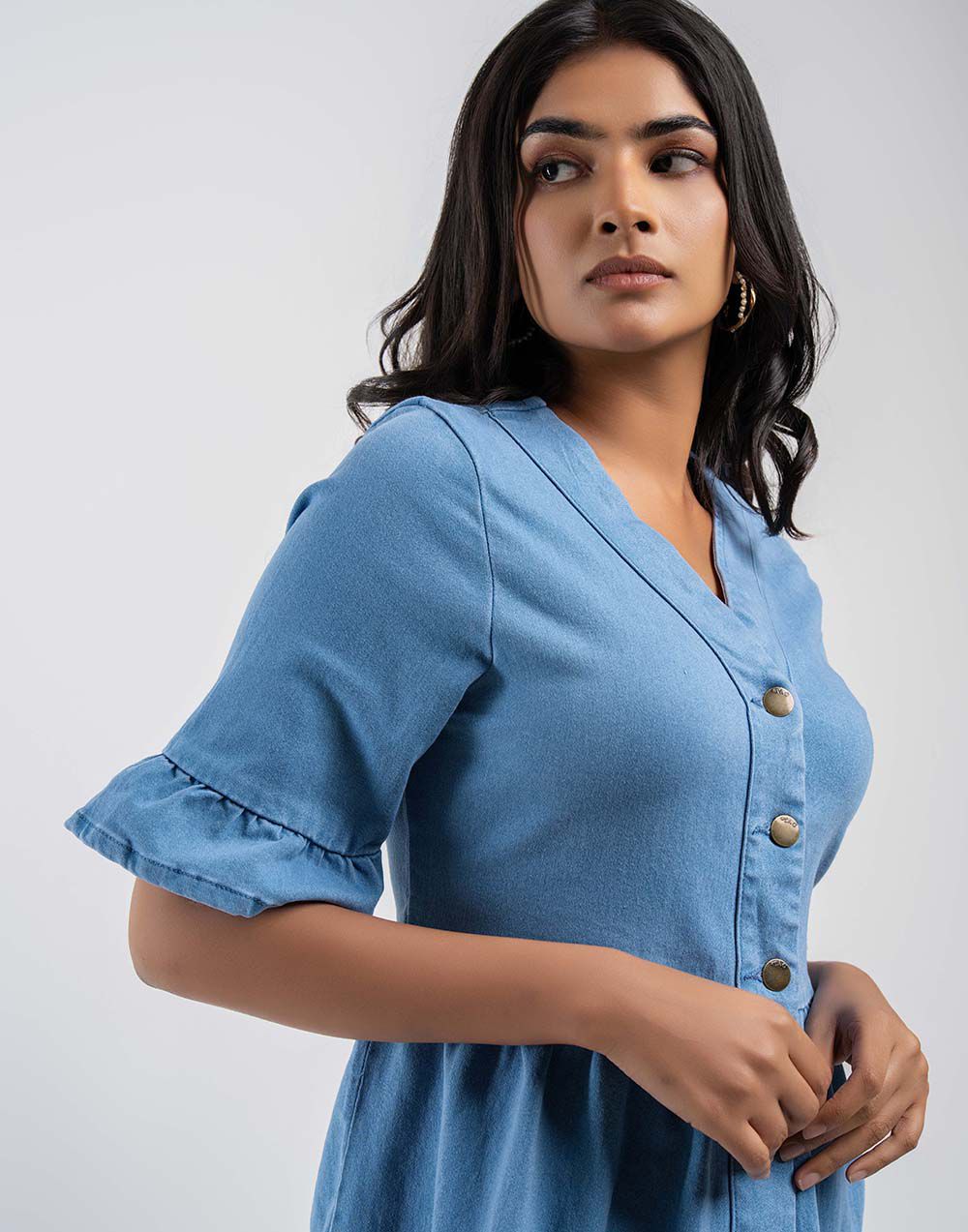 Effortlessly chic, this denim tiered dress features a knee-length design, midi sleeves, a flattering V-neckline, and five-button front fastening for added detail.