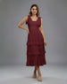 The textured midi dress. It has a square neckline and a fitted, smocked bodice. The shoulder straps are self-tie bows. The skirt features multiple ruffled tiers, creating a voluminous and flowing A-line silhouette